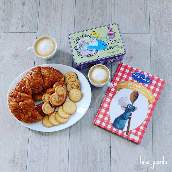 Degustar este café con espuma de leche acompañado de unos croissants recién hechos de una pastelería del pueblo, unas palmeritas y esas galletas que vinieron directas del País de la ilusión hizo que el día empezara de una manera diferente y especial. Y si mientras disfruto de este desayuno puedo ojear unas recetas del libro de Ratatouille, no puedo pedir más.