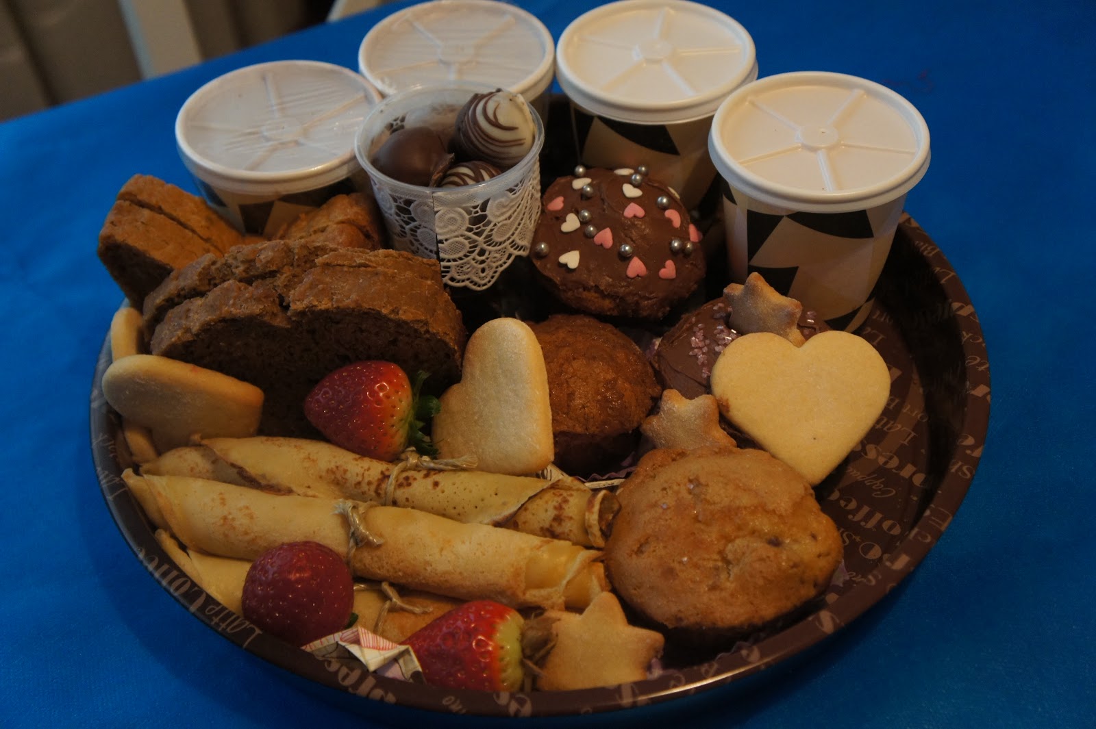 En nuestra cesta pudimos disfrutar de : dos vasos de chocolate a la taza, dos vasos de zumo de naranja natural, magdalenas de fresas naturales con nutella, magdalenas de manzana y macedonia, pastas de ron con naranja y de limón, trufas de oreo, filloas, pan de ?chourizo da terra? y pan de ajo, aceite de oliva y orégano.