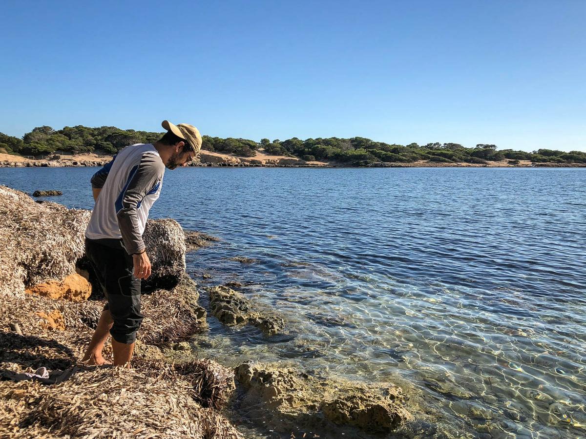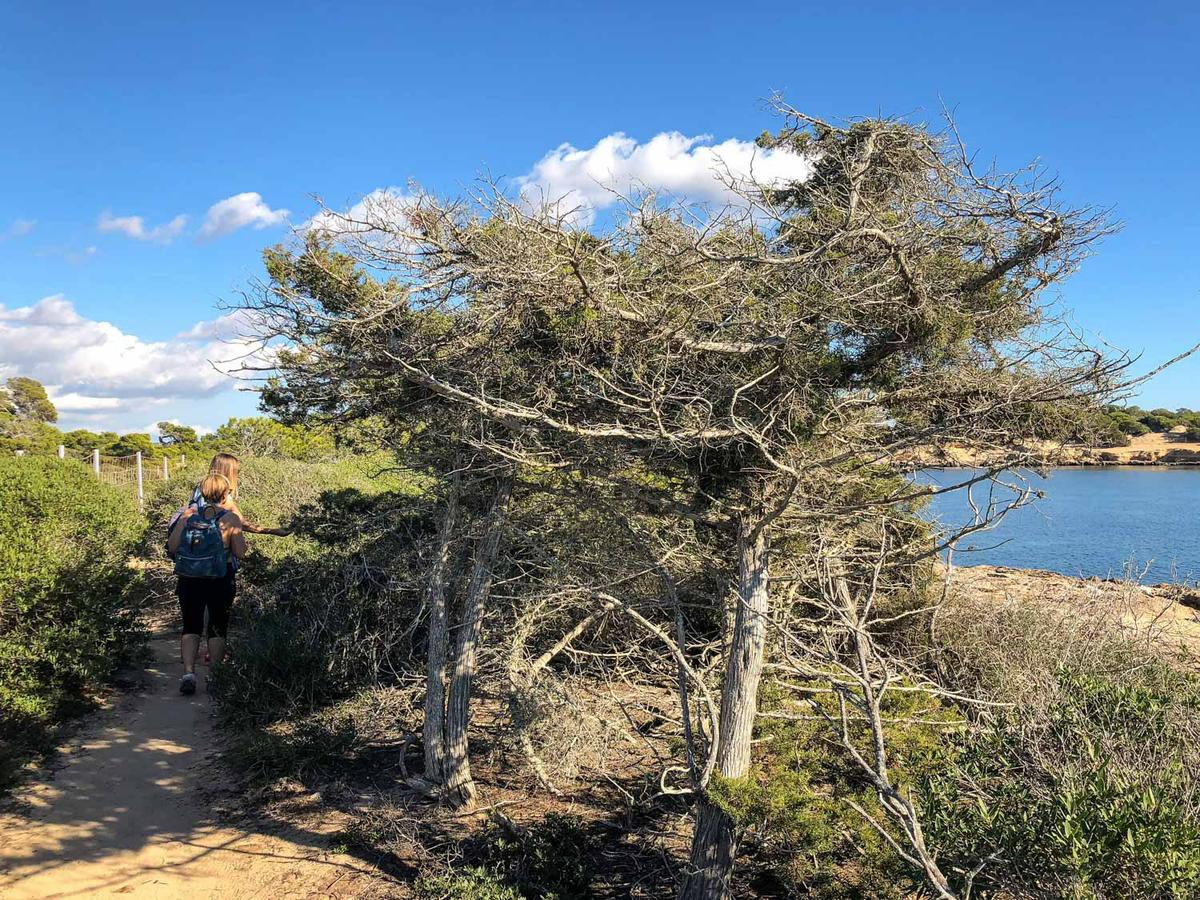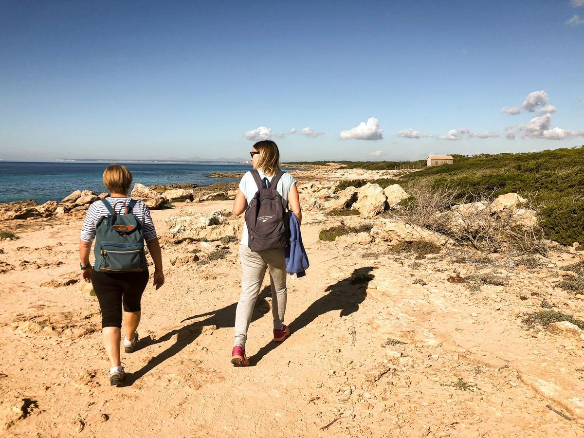 La ruta empieza en el Faro de Ses Salines, el punto más al sur de la isla, y tiene dirección oeste. Te pondrás en marcha sobre un terreno escarpado, pura roca, con el mar a la izquierda y una inmensa finca a la derecha. La valla que delimita la propiedad te acompañará todo el trayecto. Junto a ella, un sendero que tampoco te va a abandonar. Como ves, la excursión no tiene complicaciones: basta con seguir el camino hasta que te canses de andar. Para nosotros, el final está en Cala en Tugores, donde daremos marcha atrás. Una ruta sencilla con un objetivo claro: pasar un día en compañía del mar.