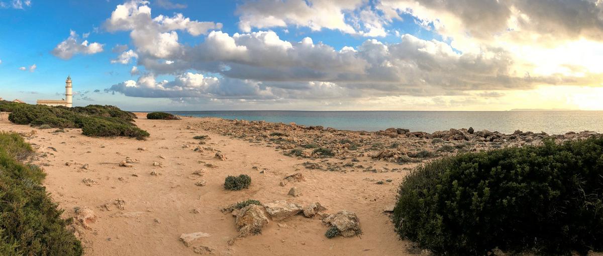 Pensando en nuestra innata capacidad para destruir el entorno diviso de nuevo el faro de Ses Salines, que ahora mira desafiante al mar. Éste le encara con gesto serio, lejos del apacible semblante que mostraba por la mañana. Cae el sol y las facciones se endurecen: nubes grises asoman en el horizonte y el mar se encrespa. Su compañía ha sido grata, pero es el momento de dejarlo a solas. Antes, eso sí, de volver de él.