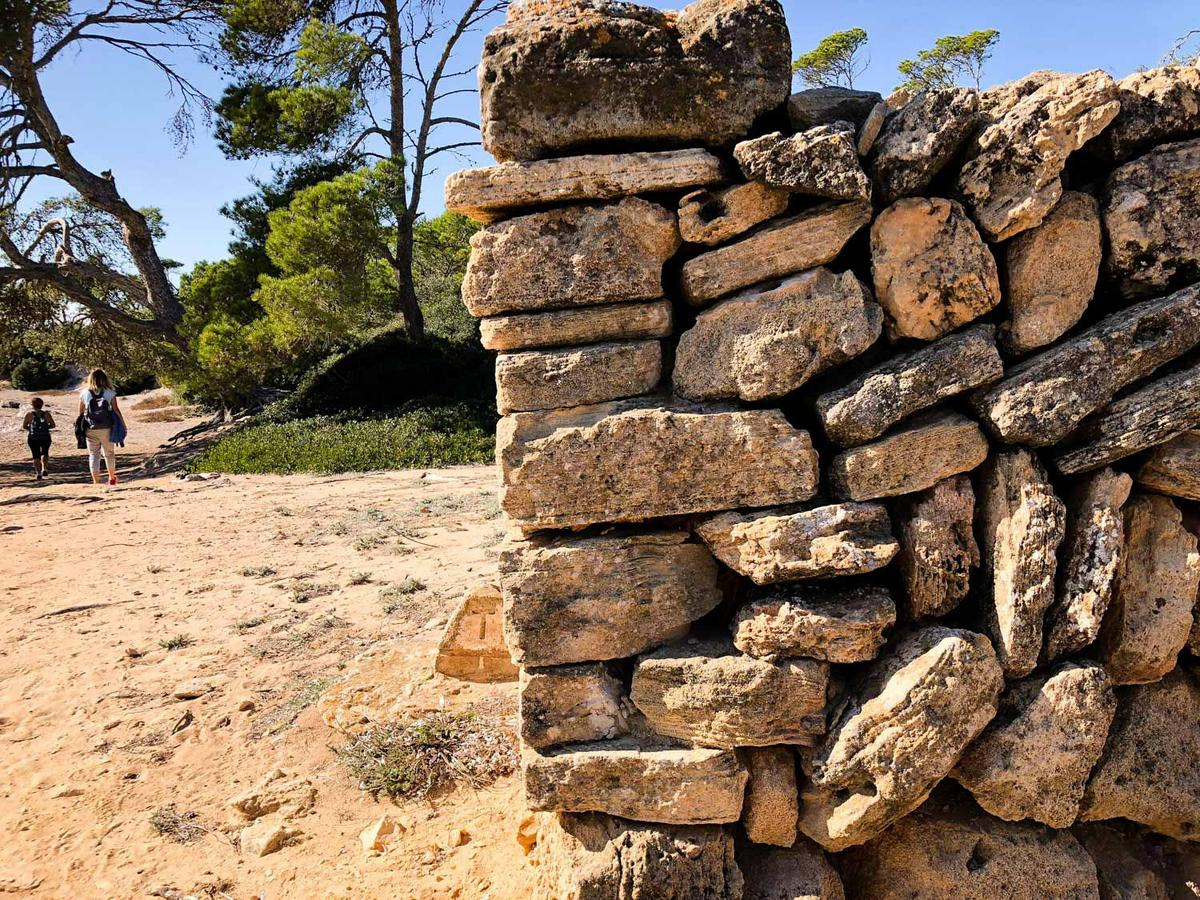 En el primer tramo deberás compartir su atención con el suelo que pisas, plagado de piedras y socavones. Los agujeros son producto de la extracción de marés, la piedra que ha dado forma a los pueblos de Santanyí: roca arenosa, sumamente porosa, que no necesita el paso de milenios para erosionarse. Durante la ruta encontrarás marés en pleno proceso de transformación: verás in situ el paso de roca a arena. Una clase de conocimiento del medio. Los primeros socavones que encontramos son perfectamente geométricos. Parece que hubieran horadado el terreno con escuadra y cartabón: cuatro bloques aquí, cinco allá, diez más acá, y ya tengo una pared de casa. El suelo se ha transformado hasta convertirse en unas pequeñas ‘médulas’ a la mallorquina —muy pequeñas, eso sí—.