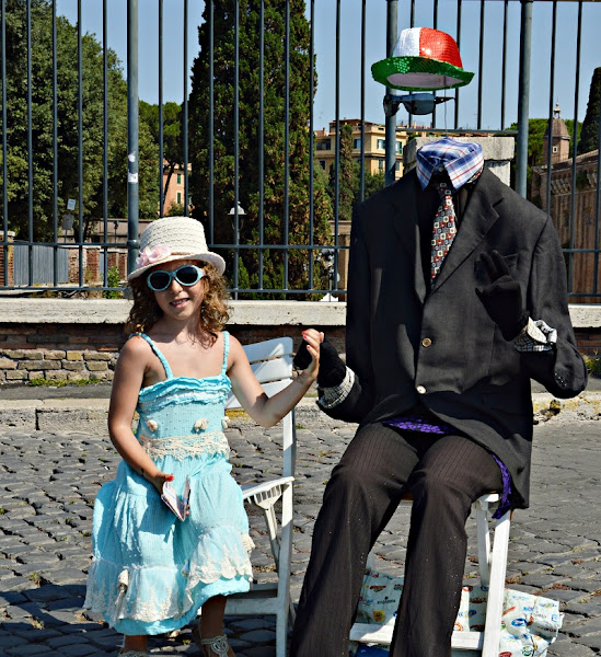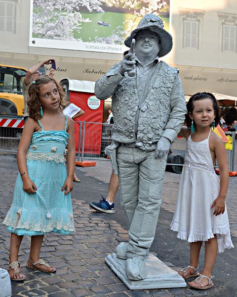 No nos engañemos, con 7 añitos ver estatuas y edificios a todo correr no resulta ser de lo mas divertido para ellas, pero si entre edificio y edificio encontramos amigos que nos ayuden a divertirlas, pues nos hacen un gran favor, y eso fue lo que hicimos, aprovechar los artistas callejeros que habían por toda la ciudad, para jugar a un juego, ¡encontrar el mas original! incluso tuvimos un ganador. Así que a la pregunta de si merece la pena ir a Roma para pasar un solo día allí, ¡Claro que sí!