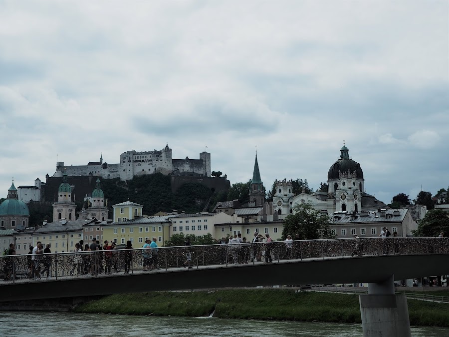 ¡Salzburgo es una ciudad de lo más sensacional! Me impresionó un montón el contraste que por allí hay, entre lo moderno y lo tremendamente tradicional. Su casco antiguo de estilo barroco, es simplemente impresionante y en él no falta detalle. Hasta está rodeada de un paisaje montañoso espectacular: ¡los mismísimos Alpes! A todo esto, vamos a sumar su importancia cultural porque se trata de la ciudad natal del entrañable genio musical *Mozart*. De ahí que sea mundialmente famosa por sus festivales musicales y eventos culturales. Su amplio río *Salzach* cruza la ciudad, y sobre él abundan los puentes que te permiten cruzarlo tan ricamente de aquí para allá. El más bonito de todos es el llamado *Makartsteg*, que está lleno de candados que miles de personas allí dejaron. Por amor, curiosidad, suerte o simplemente dejar huella en la ciudad. ¿No os parece una preciosidad?