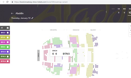 Pero con mucha suerte si uno va temprano, encuentra incluso para una de las obras mencionadas (menos Rey León – que no está nunca con descuento), así fue como compré la mía para nada más que ¡Aladdino!, las conseguimos en $90 cada una en la sección orquestra y cómo ven en la imagen con el precio, este valor fue una ganga.