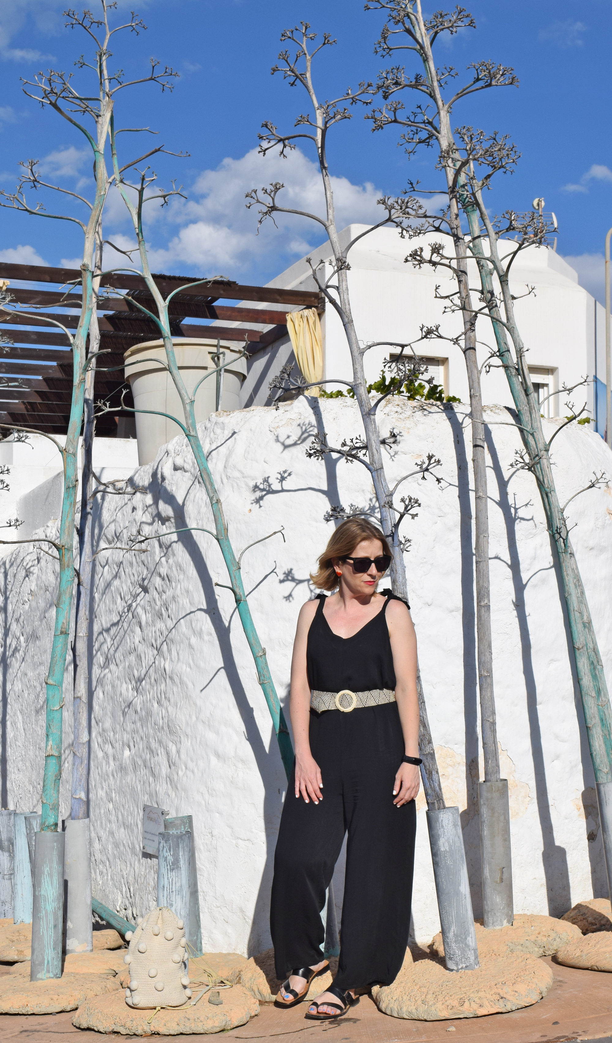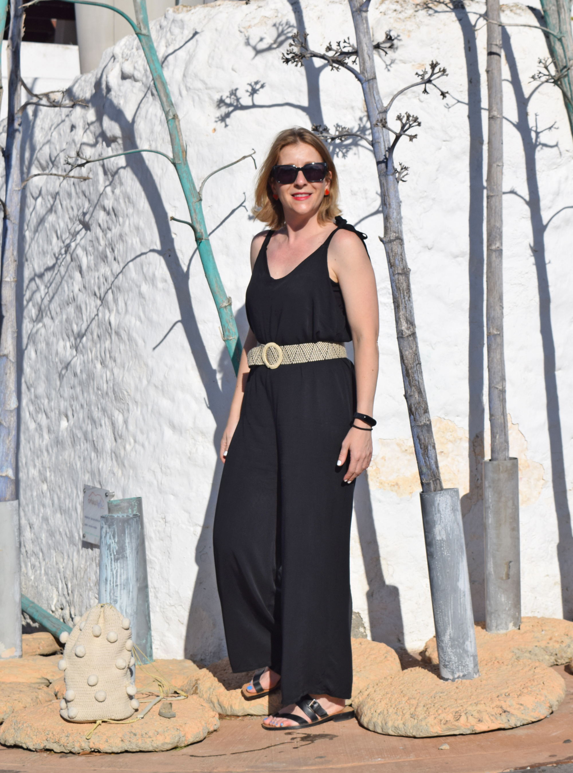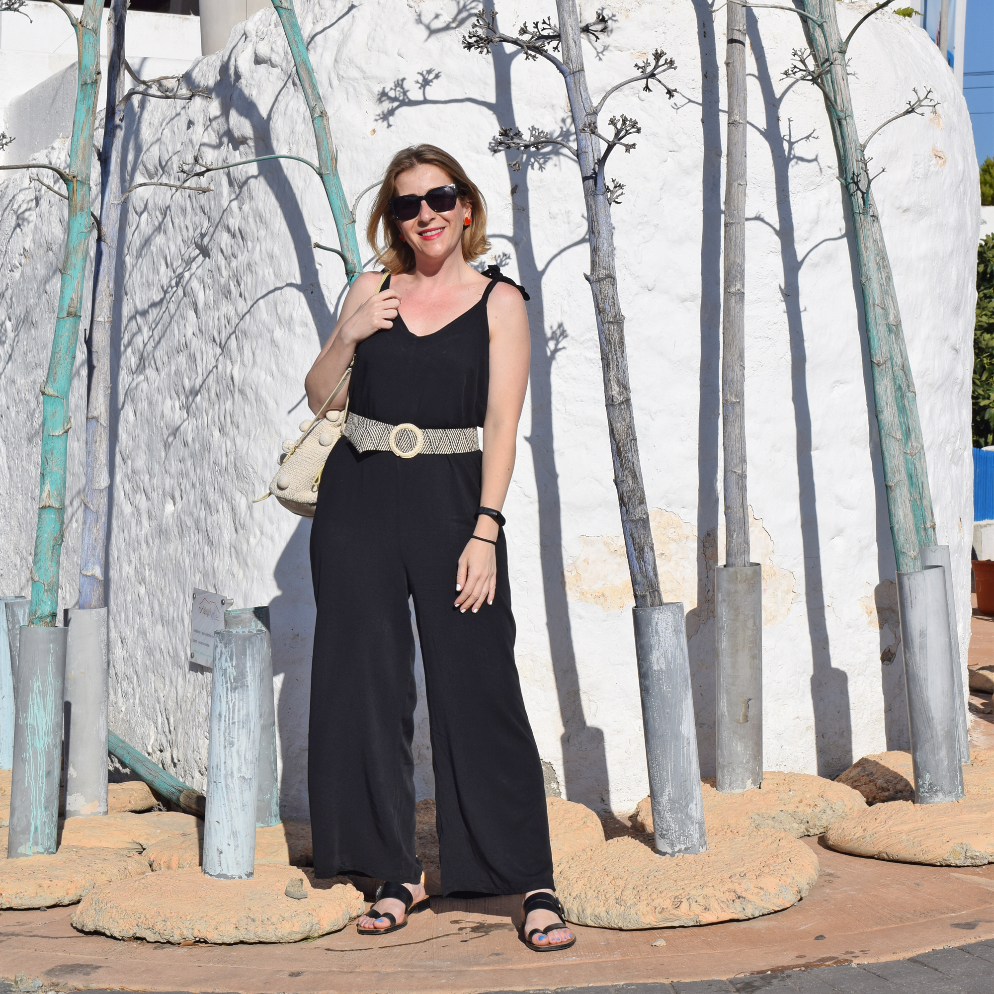 De paso, os enseño el look que llevaba para esa tarde, un mono negro con un tejido de caída perfecta, ultra cómodo, acompañado de sandalia plana y mochila todoterreno.