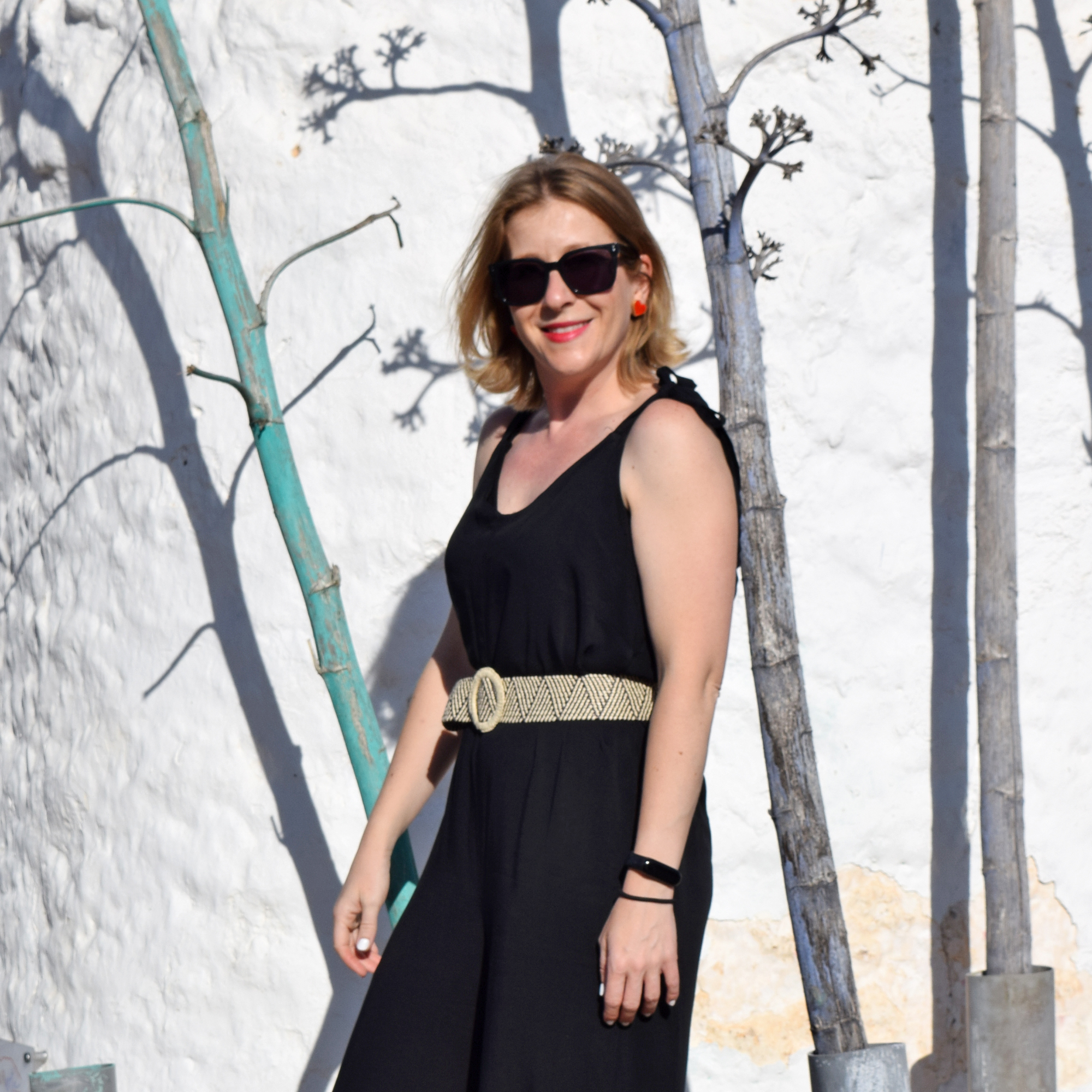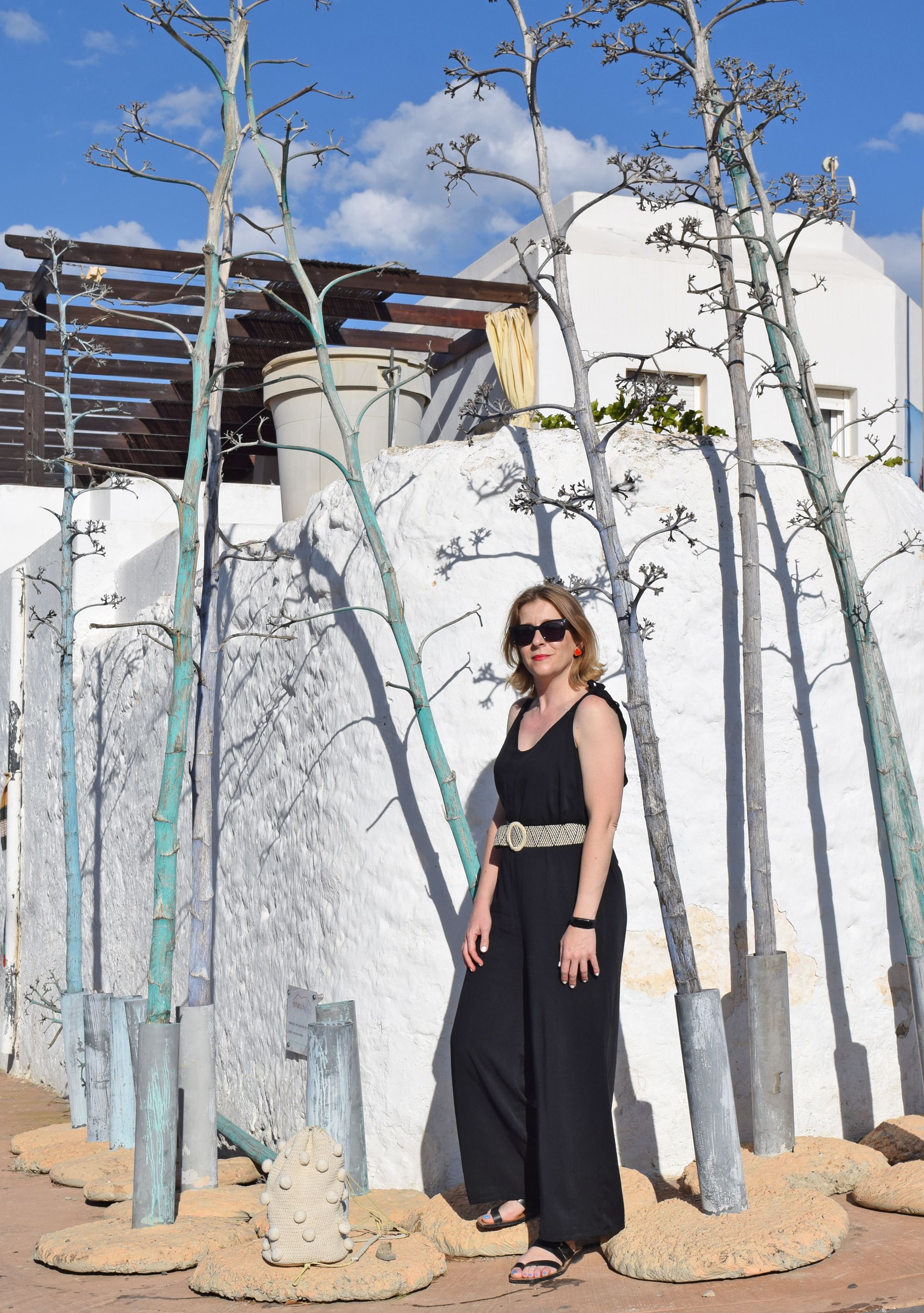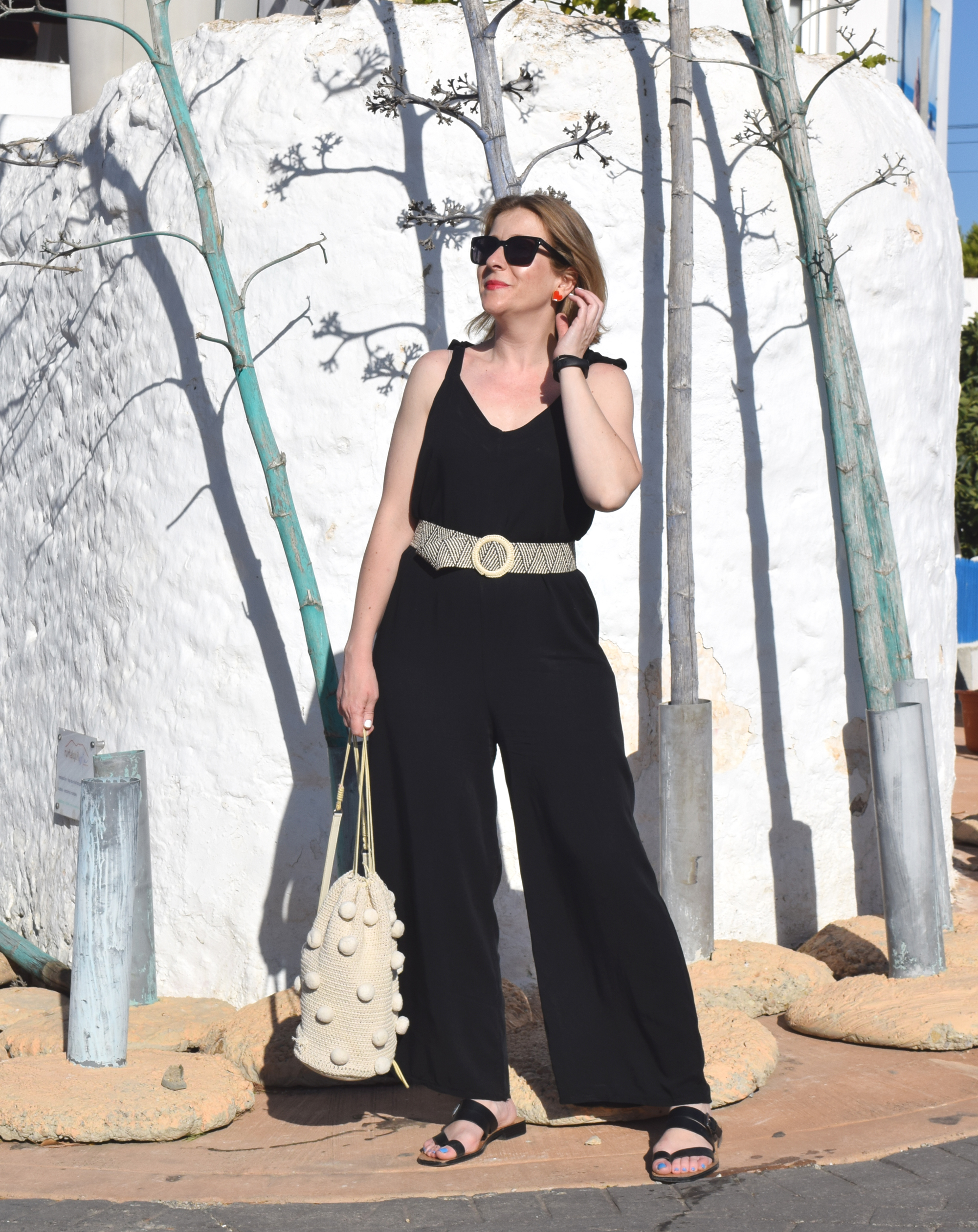 De paso, os enseño el look que llevaba para esa tarde, un mono negro con un tejido de caída perfecta, ultra cómodo, acompañado de sandalia plana y mochila todoterreno.