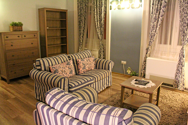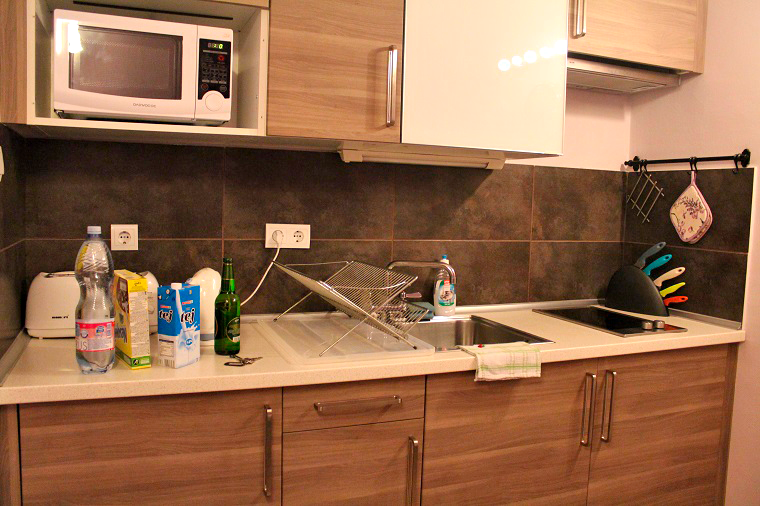 La cocina en cambio era ligeramente la de mis sueños. Estaba completa, muy curiosa y moderna y el salón-habitación tenía un pequeño sofá súper cómodo y un sillón., además de tele plana que no nos servía para nada porque todo era en húngaro, calefacción a tope hasta el punto que pasábamos calor por las noches, enormes ventanas (era muy luminoso) y una cama de futón que ya comprobamos al dormir que era algo incómoda.
