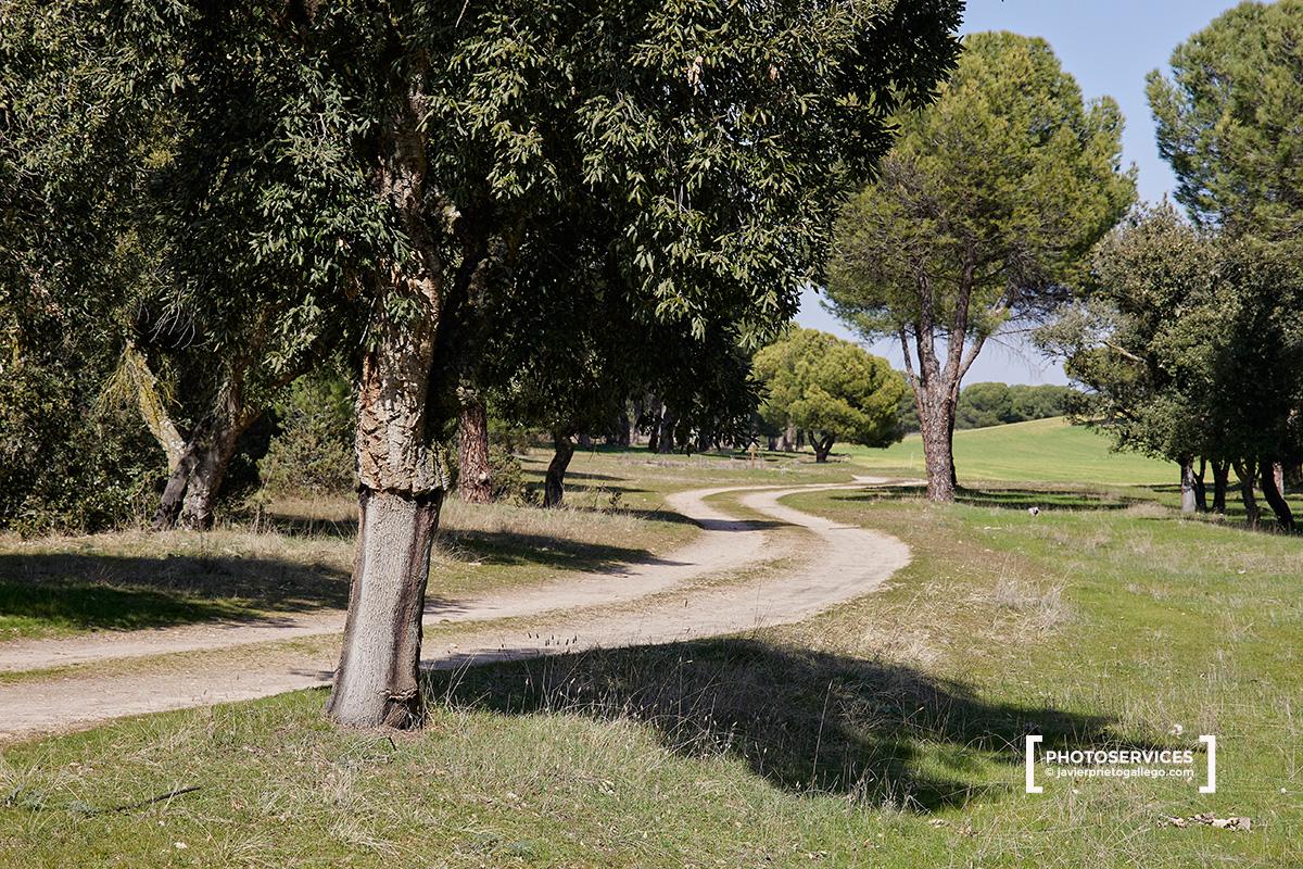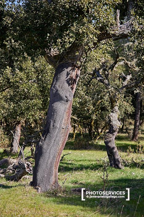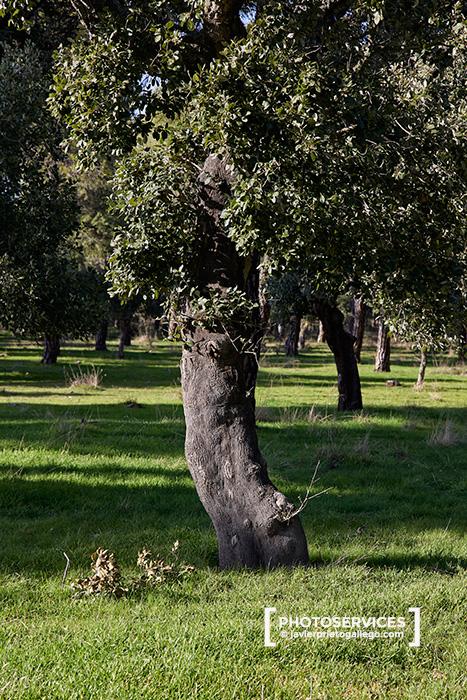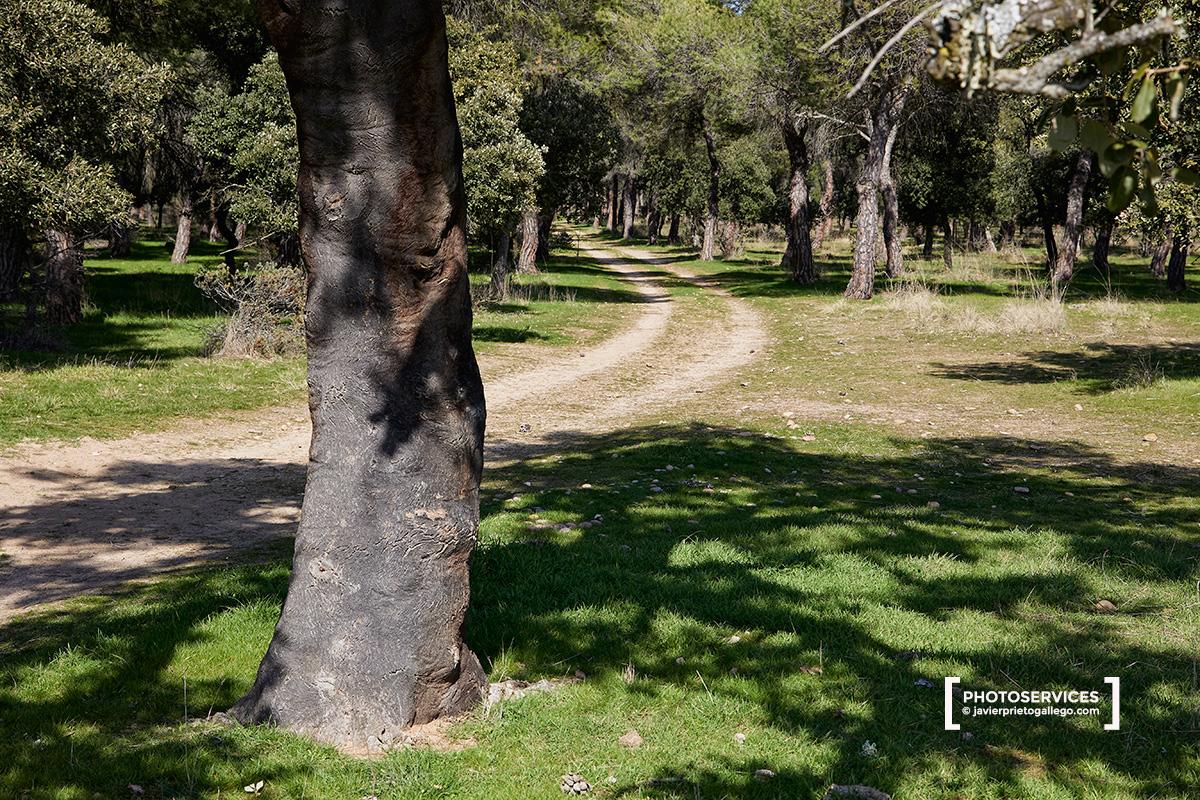 Pero el paseo continúa por el camino que se interna por lo más denso de la mancha forestal hacia el norte. De hecho, no se tardan ya en descubrir, a uno y otro lado del camino, ejemplares de distinto porte de quercus suber, alcornoques que aparecen mezclados con pinos, encinas y quejigos en distintas densidades, conformando una dehesa de gran interés y mucho valor biogeográfico y paisajístico.