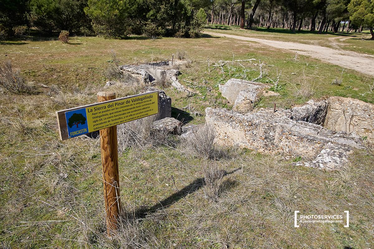 El regreso hacia Foncastín comienza 1,2 km más allá, después de dejar atrás un primer cruce, donde se toma, una vez más, el ramal de la derecha. Como de nuevo se gira a la derecha un kilómetro y medio después al alcanzar un cruce de varios brazos. Antes, como a mitad de camino, habremos pasado por unas sencillas ruinas de las que, de no ser por la señalización que hay junto a ellas, sería muy difícil deducir que se trata los cimientos de la antigua serrería de Valdegalindo. Según el cartel, estuvo en funcionamiento hasta principios del siglo XX, se alimentaba de la electricidad que le llegaba desde Tordesillas y servía para cortar los costeros y tablones que se sacaban del pinar.