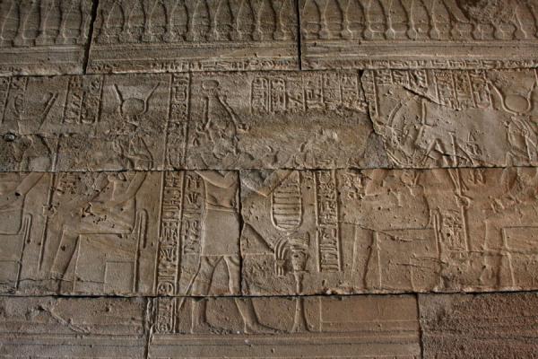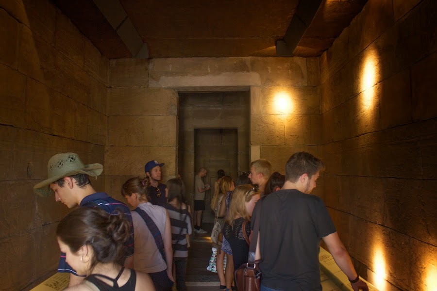 La actual ubicación del templo reproduce su colocación originaria, no obstante incluye una instalación de agua para controlar el acceso del público. El templo emula así la vía sacra en la que se asentaba y las tres puertas monumentales. Los muros exteriores son lisos y su fachada principal se encuentra porticada. El conjunto está construido íntegramente en piedra arenisca, típica de la arquitectura egipcia. El interior se estructura a través de la capilla fundacional, el núcleo del edificio que comunicaba con el vestíbulo y el resto de estancias.