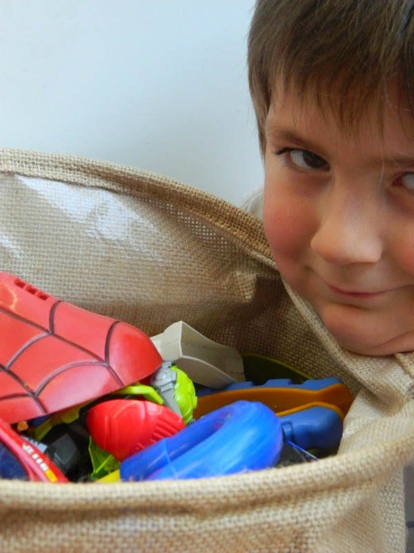 Coherente con el tema de la semana, mi creación frugal para este viernes es una bolsa de arpillera para guardar los juguetes de Camilo. Para todas las que tienen -o tuvieron- niños, hay una realidad inexcusable: con los años, la cantidad de juguetes se multiplica exponencialmente. Llega un momento en el que la convivencia con las piezas de plástico es invasiva. Están por todas partes, las piso cuando camino dormida (ayer dejé rengo al Hombre Araña. Sorry Peter, con un gran don, llega una gran responsabilidad), me encuentro animales de granja nadando en la ducha y dormimos entre Miguel Angel y Leonardo (no, no son alusiones artísticas. Son "Las tortugas ninja").