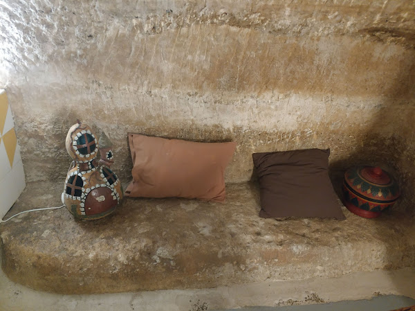 Te reciben un montón de plazas de aparcamiento reservadas para los clientes, justo enfrente de las cuevas y ya empiezas a vislumbrar que donde te vas a meter nunca lo habías hecho antes. Se ven dos plantas de cuevas, unos agujeros en la montaña en el piso superior y un murete decorado en el inferior. Nos dirigimos a recepción, donde también tienen un bar con terraza para tomar algo, y unas chicas encantadoras nos dan las llaves de nuestra cueva y nos acompañan hasta ella. En nuestro caso teníamos una reservada para ocho personas (cuatro adultos y cuatro niños).