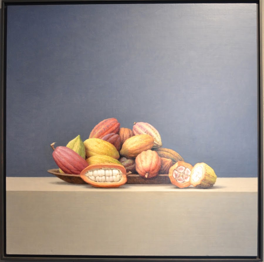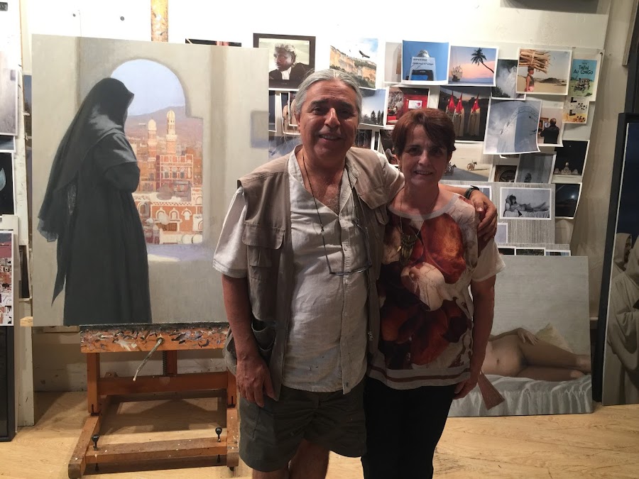 En un nivel inferior bajo del hall, está el taller del Maestro, que da a otro patio de luz donde lucen modelos en vivo de bodegones y lienzos pintados, en espera de correcciones y retoques. Entramos a su taller, allí estaban su atril, su mesa donde reposan infinidad de pinceles, telas enormes adosadas a la pared, con obras espectaculares, etc. sobrecoge estar ahí, rodeado de tanta obra de arte y junto al pintor realista más famoso de Chile, en la actualidad. Al otro extremo, un lugar para su escritorio, con su computador donde suena una música latina, a continuación la salita de estar, en cuyo lugar se desarrolló una entretenida conversación, junto a ella una inmensa biblioteca con los libros de su vida y obras…Estar allí es un verdadero privilegio.