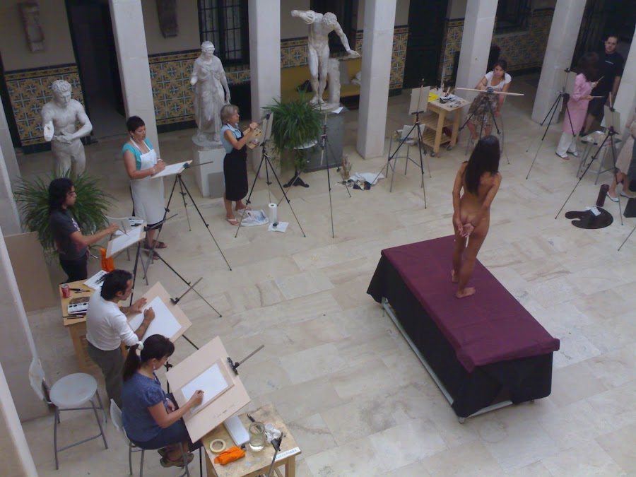 Y a la derecha la oficina de su secretaria, Aurora. Al frente un gran hall, iluminado con luz natural que se filtra a través de su techo de vidrio, dando vida a una serie de bellas estatuas que en su momento sirvieron como modelo en el aprendizaje de las técnicas pictóricas de los alumnos.