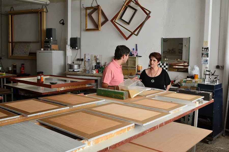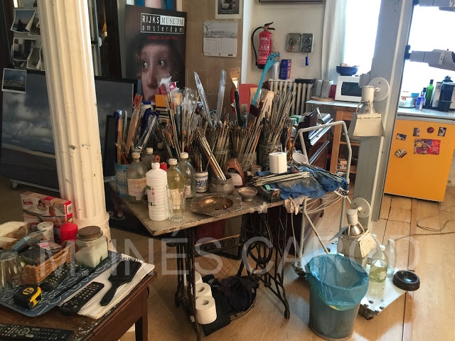 Finalmente salimos a otra área donde están los talleres de imprimación y armado de telas, que antes también era para los alumnos. Hoy se confeccionan ahí solo las telas para el Maestro y quién se encarga de eso es José Miguel, un chileno que se quedó a vivir en Chinchón.