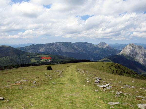 Regresamos al collado y nos dirigimos ahora a Urkiolagirre. Sus verdes praderas parecen decirnos ven.