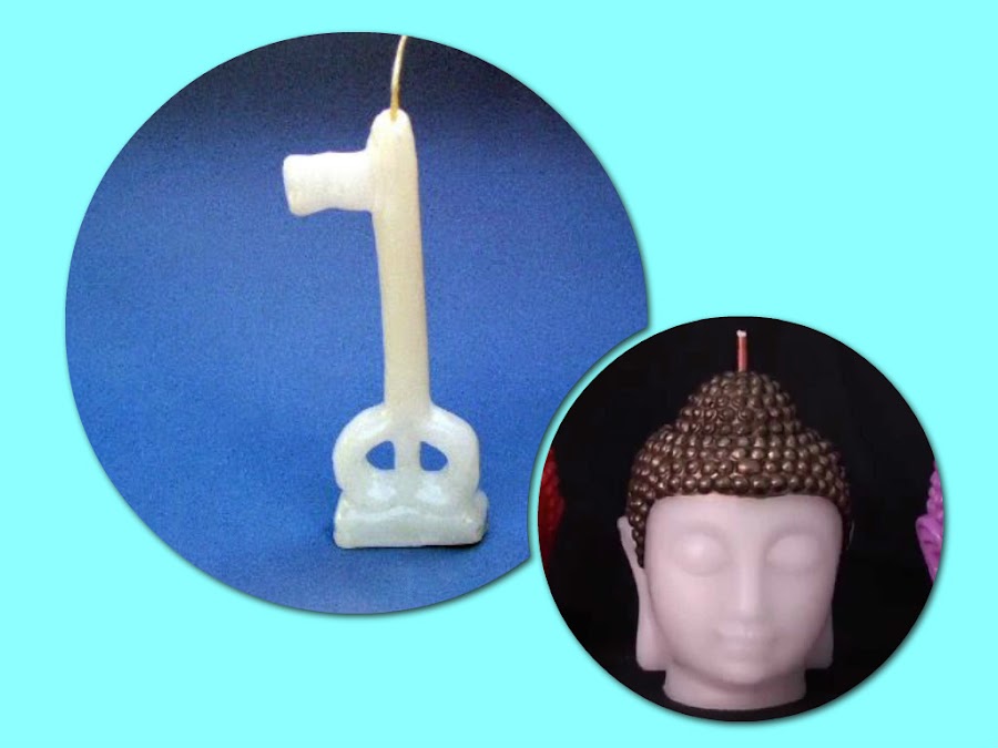 Vela con forma de buda.- usada para peticiones de buena suerte y felicidad, esta vela atrae la fortuna, los colores más utilizados son el blanco y el amarillo.