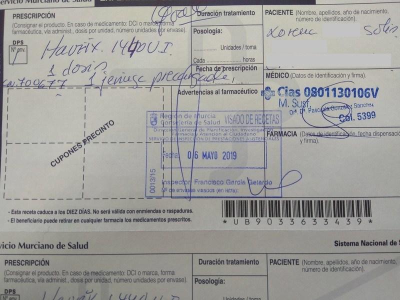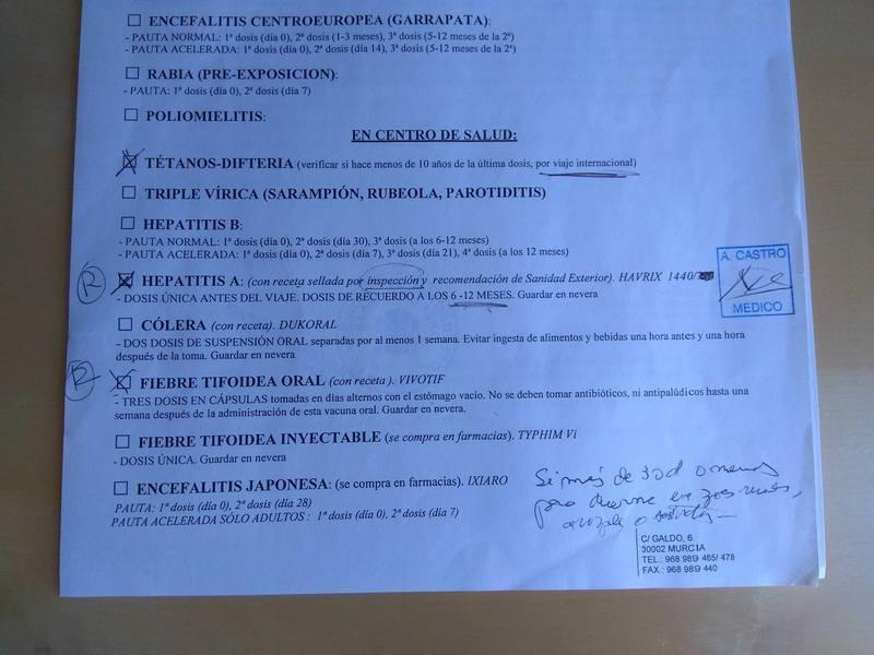 IMPORTANTE: para que la Seguridad Social os cubra parte del precio de la vacuna de la hepatitis A, tenéis que ir al Centro de Inspección Médica de Servicios Sanitarios de vuestra ciudad (en Murcia se encuentra junto al centro de salud de San Andrés) para que os visen la receta, por medio de un sello. No olvidéis llevar también el informe médico del centro de vacunación.