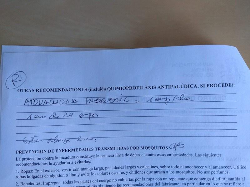 Paludismo o malaria (Proguanil): la caja trae 12 comprimidos y, como os tenéis que tomar 22 pastillas, os tienen que hacer dos recetas. Os tenéis que tomar una antes de iros de viaje, una al día durante al viaje, y otras siete (una al día durante siete días) a la vuelta. Es muy recomendable tomar los comprimidos con el estómago lleno, así que os aconsejo hacerlo durante el desayuno.