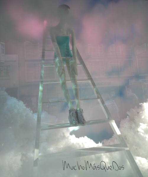 Mira los escaparates que nos reciben. La temática son los zapatos, el andar entre nubes y sentir estar el cielo..