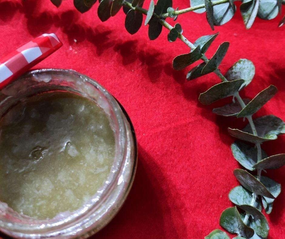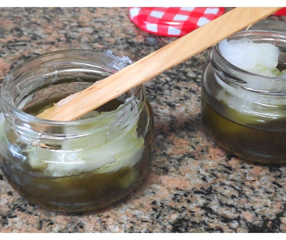En un bote de cristal estéril introduciremos el eucalipto troceado y añadiremos el aceite de coco. El de oliva lo reservaremos.