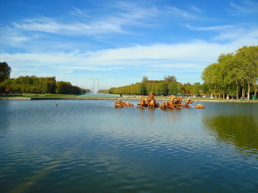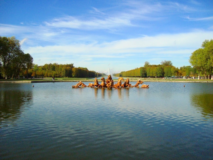 Un Apolo dorado, montado en su cuádriga es la imagen más representativa del reiado de Luis XIV y de Versalles. Situado en el centro de los jardines, este grandísimo estanque ejerce de punto neurálgico en el universo versallesco y representa el poder del rey.