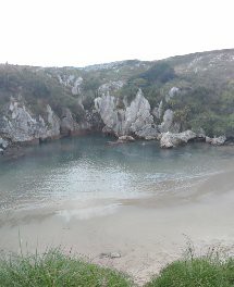 Otras playas... famosa es la de Gulpiyuri, que es como una playa de interior, se cuela el agua del mar por un estrecho paso y parece que nace de una fuente natural en tierra. Me decepcionó un poquito. Quizá fueron las grandes expectativas... Quizá porque la vimos el último día y ya había visto las otras mucho más grandes, pero vamos, parece un lugar exótico como para grabar una peli como la de "El lago azul". Bonita, lo es.