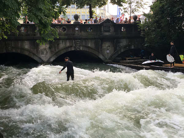 Lo que más me sorprendió de Múnich fueron los surfistas que en plena ciudad, en el Jardín Inglés, aprovechan las olas del río artificial Eisbach para surfear, justo después de pasar el puente cerca del museo de arte Der Kunst Haus.