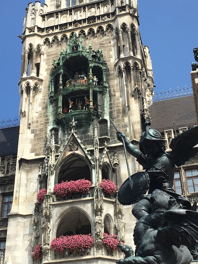 Marienplatz es el corazón del casco antiguo, en cuyo centro está la columna de María que le da nombre, pero lo más destacado de esta animada plaza es el Nuevo Ayuntamiento, con una esplendorosa fachada neogótica muy recargada, siendo la mayor atracción turística el carrillón en el que cada día a las 11 y a las 12h. salen sus figuras para realizar una agradable danza con música.