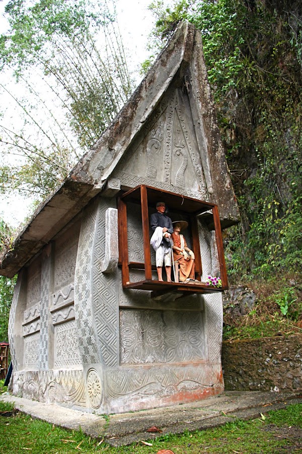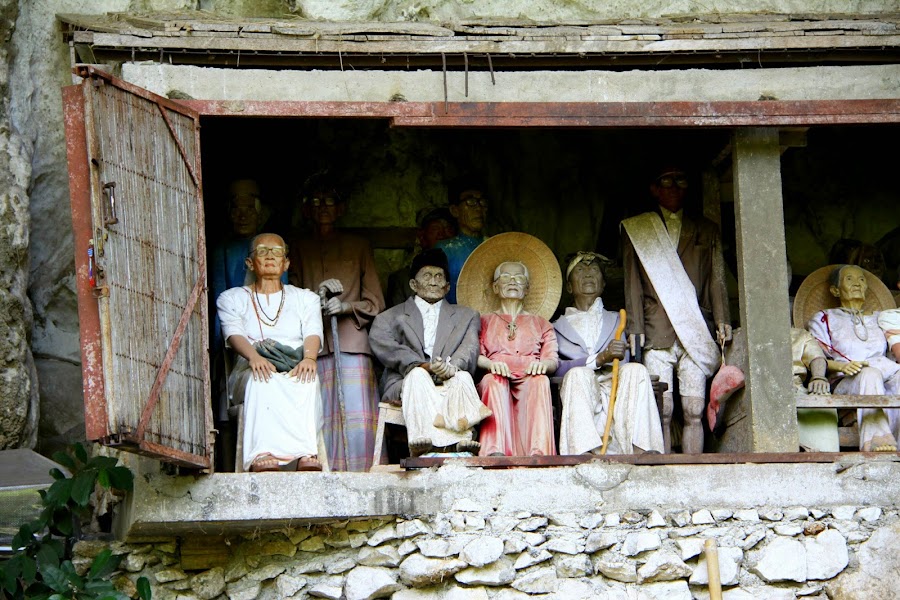 Pero, en casi todos los casos, las entradas de las tumbas suelen estar guardadas por unas figuras talladas en madera, y vestidas, los muñecos "Tau-Tau", que representan a los antepasados, y a los difuntos que están en ellas.