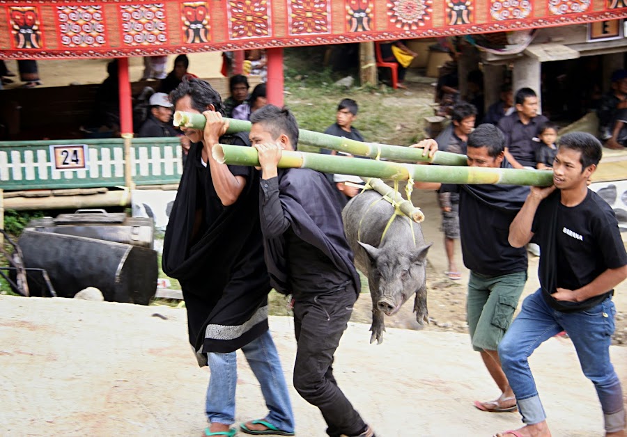 Entre las ofrendas se incluyen búfalos, y cerdos... que después serán sacrificados, y se cocinarán y comerán los asistentes.