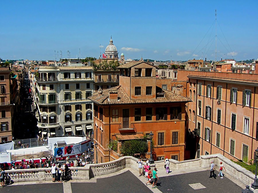 Con una historia tan larga, y con tanta cantidad de monumentos, es lógico que, siempre que se visita Roma, nos tropecemos con algún edificio, fuente, estatua... en reparación. Ya me ocurrió en 1999, cuando, en lugar de ver la plaza de San Pedro, me encontré con unas "bonitas" lonas. Y esta vez le ha tocado el turno a la fuente de la Plaza de España, y la iglesia de Trinitá dei Monti (con lo cual, las fotos desde las escaleras de la plaza se "desgraciaron", como podéis ver en esta perspectiva "hacia abajo", aunque "hacia arriba" era peor).