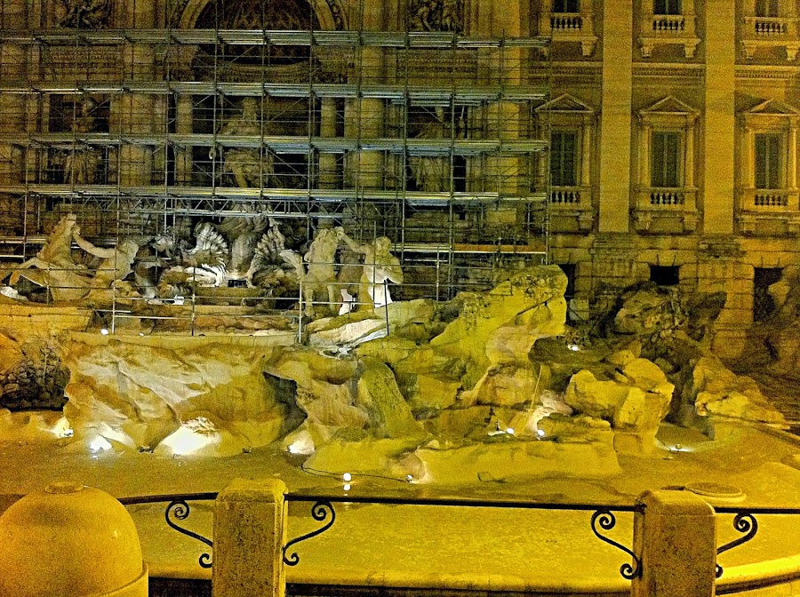 No sólo está cubierta de andamios, como podéis ver, sino que tampoco tiene agua, y han puesto un muro de cristal para que la gente no tire la tradicional monedita para volver a Roma; muro que no sé si será provisional, mientras duren las obras, o definitivo (aunque supongo que lo retirarán, que el ayuntamiento recaudaba una pasta considerable con las dichosas monedas, jajaja).