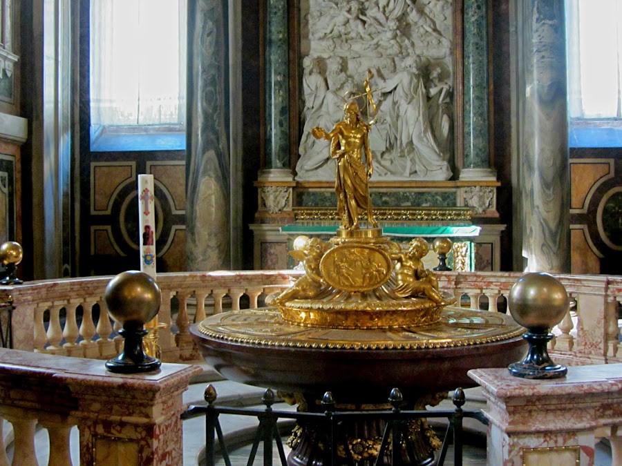 Una cosa curiosa que he observado tanto en esta basílica como en Santa María la Mayor es que en la nave central, frente al altar mayor, no hay bancos fijos, como en casi todas las iglesias que estamos acostumbrados a ver, sólo los hay en las capillas laterales. Cuando hay misa, ponen sillas, que retiran después de la celebración.