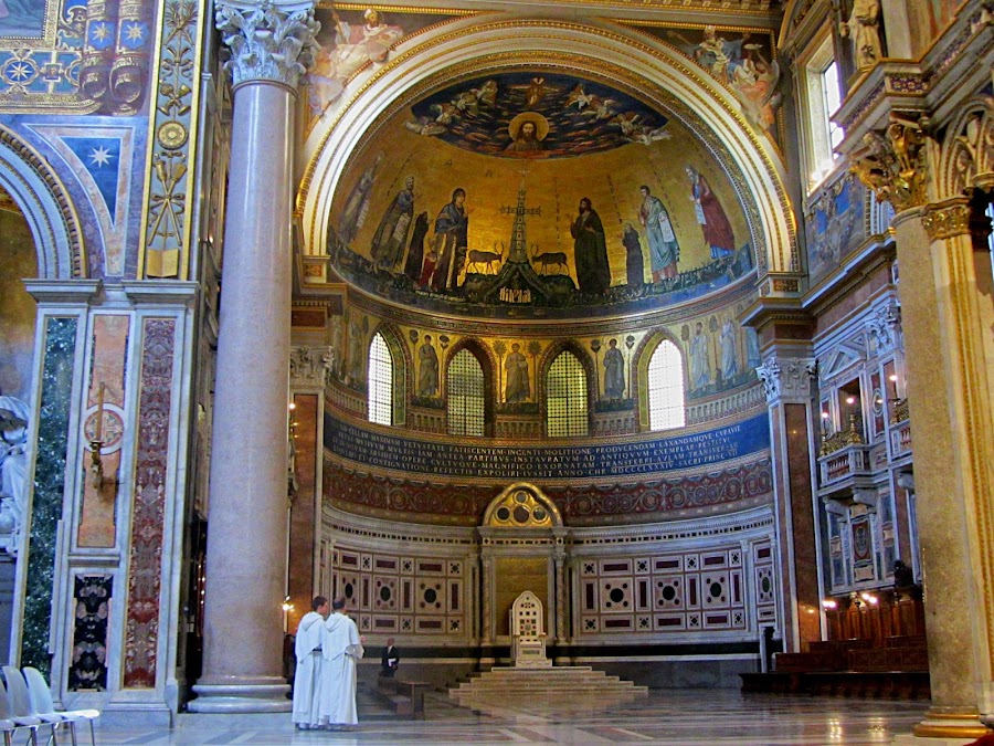 Es, quizá, la iglesia de Roma que más me gusta. Y, en comparación con otras, como el Panteón o la basílica de San Pedro, no está tan tomada por los turistas. No es que esté vacía, ni muchísimo menos, pero se puede pasear por ella tranquilamente, salvo si hay misa en el altar mayor, que no dejan tomar fotos. Pero, para entretener la espera, podéis visitar un pequeño y curioso museo de objetos litúrgicos, o subir al piso superior (hay que pagar entrada, y las visitas son guiadas), donde podréis ver los mosaicos.