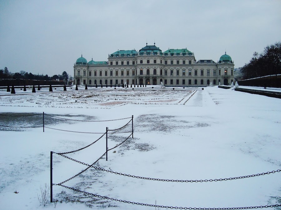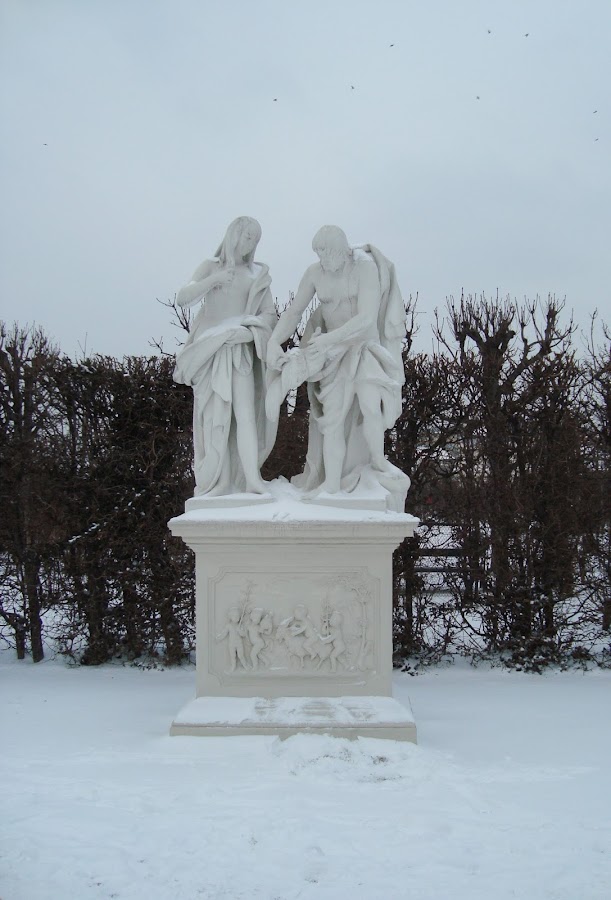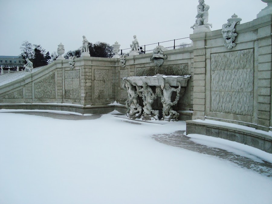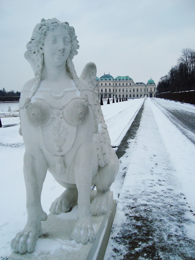 Salimos al nevado jardín y subimos una pequeña cuesta que nos lleva, atravesando un espacio de fuentes congeladas, esculturas clásicas y setos hasta el Belvedere superior, escoltado por enormes esfinges.