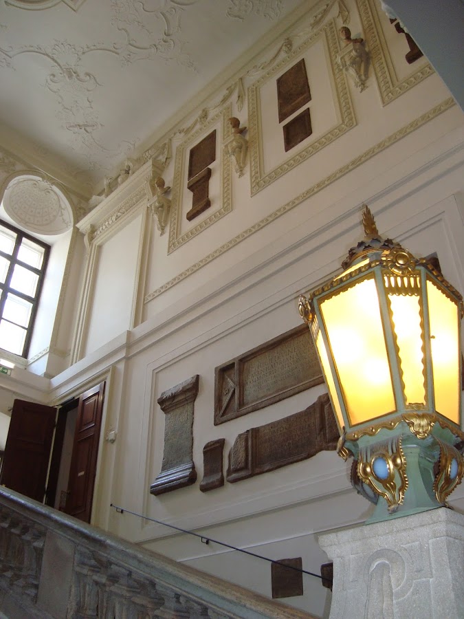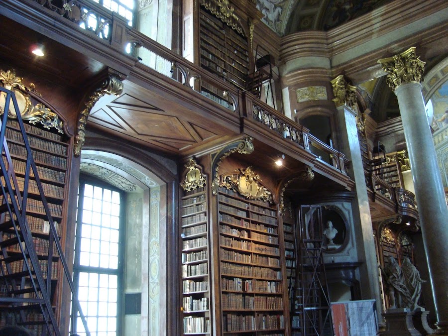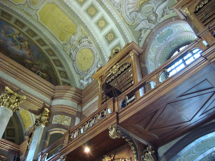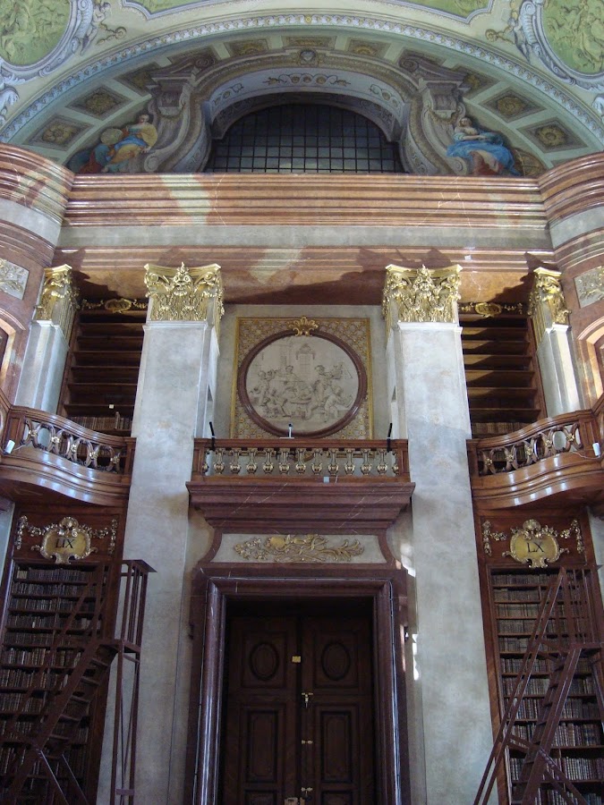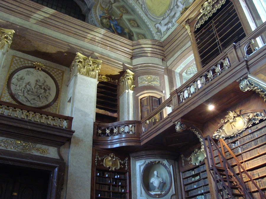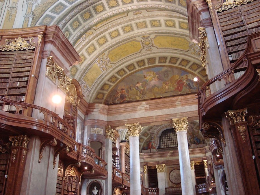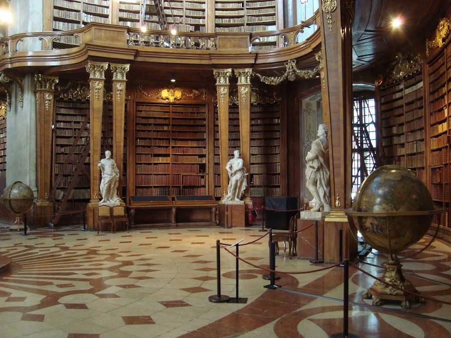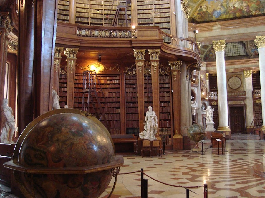 También una estatua de Carlos, como Hercules Musarum, preside el espacio bajo la cúpula, rodeado por cuatro globos terráqueos barrocos. Junto con otras estatuas de mármol de los hermanos Strudel y las magníficas librerías de nogal, representan una auténtica biblioteca universal barroca del siglo XVIII.