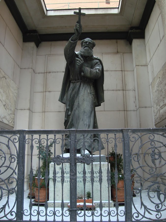 Antes de entrar, en la fachada, en un nicho a la izquierda, encontramos una estatua del capuchino Marco d"Aviano, impulsor de la defensa contra los turcos en 1683, una estatua a cielo abierto, por cierto.