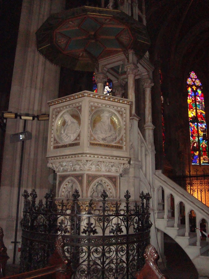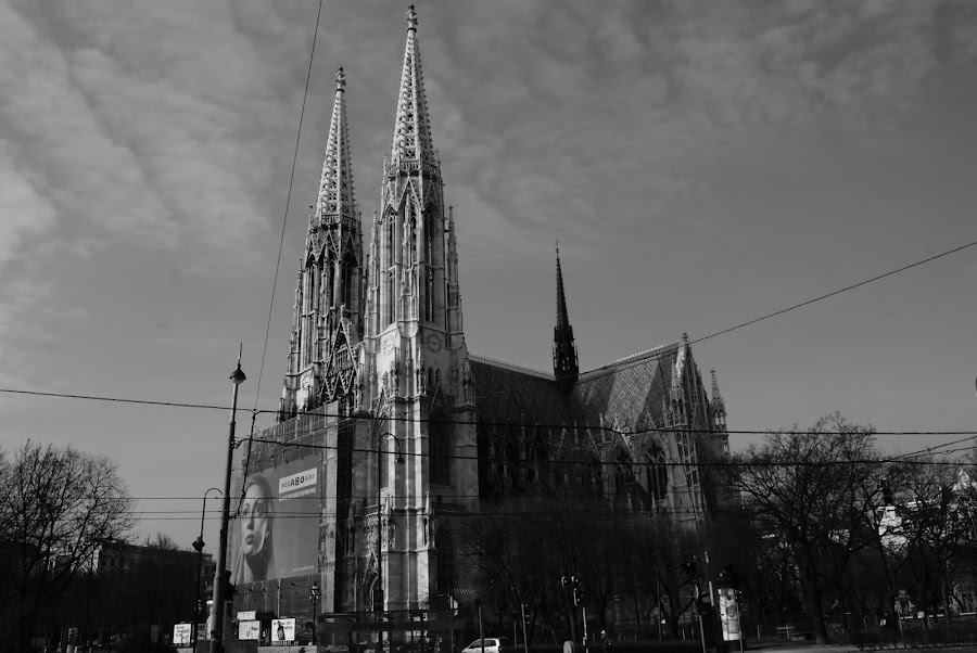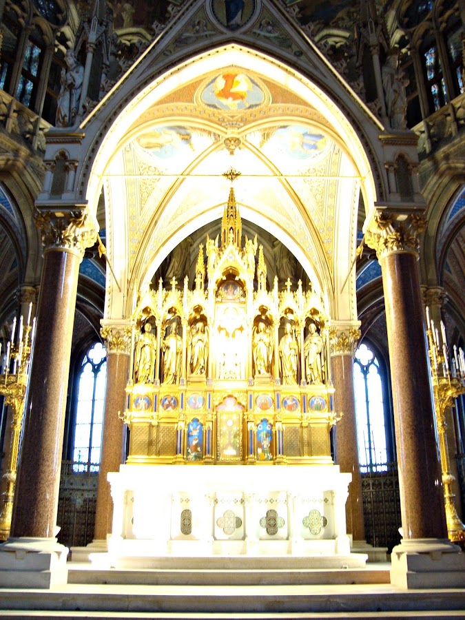 Pero la insistencia vale la pena, porque si el exterior, es bastante impresionante por la altura de las agujas, que inevitablemente me recuerdan a las de la catedral de Colonia, el interior es frio pero cautivador. Empezando por el origen del templo, que tal y como ocurrió en San Salvador sobre la Sangre Derramada en San Petersburgo, se edificó sobre el lugar del atentado contra un miembro de la realeza, en este caso Francisco José en 1853.