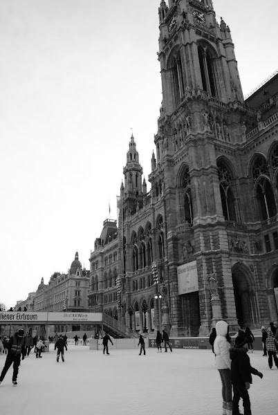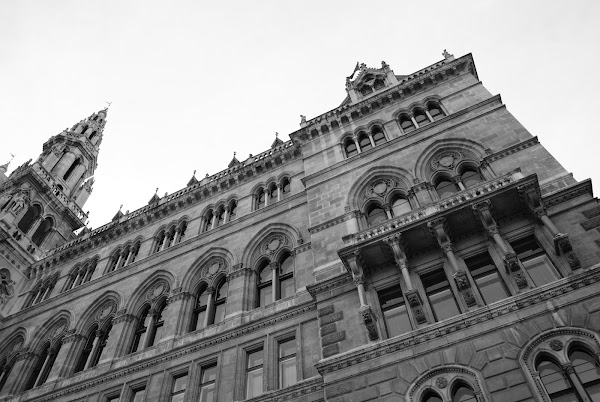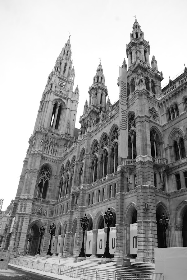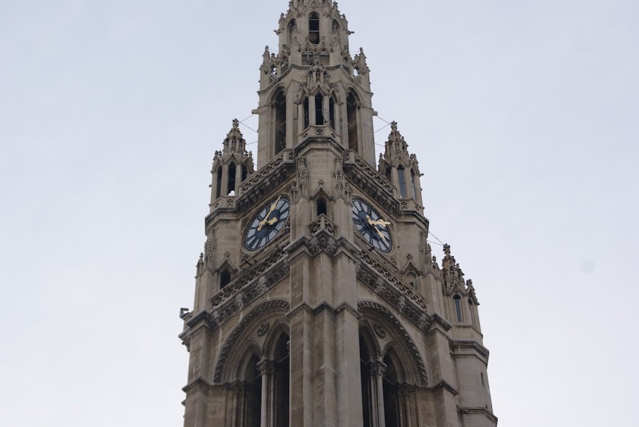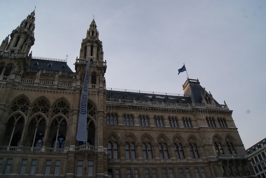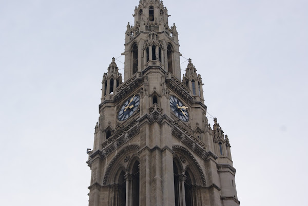Aunque ya lo había visto en fotos, cuando llegué a su lado, pude confirmar el parecido, casi exacto con los ayuntamientos flamencos, y más concretamente con el de Bruselas, con sus torres de filigranas, altas y esbeltas. El de Viena también es de estilo neogótico con una aguja central que se eleva hasta los 102 metros de altura, incluyendo un caballero con estandarte que la corona.Además, en todo su perímetro se abren arquerías con estatuas de las personalidades de la historia de Austria.