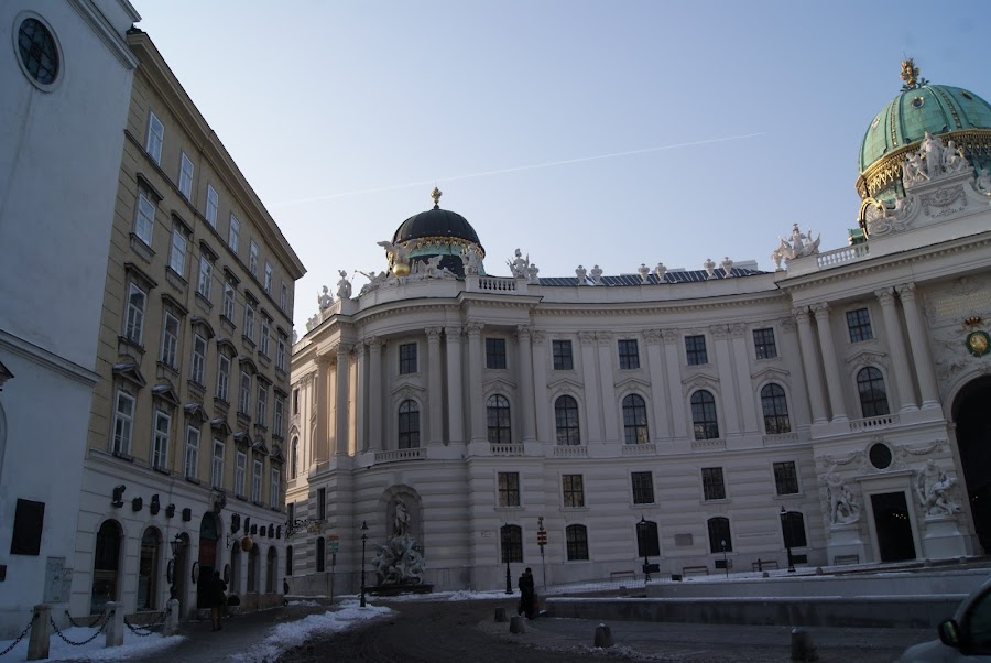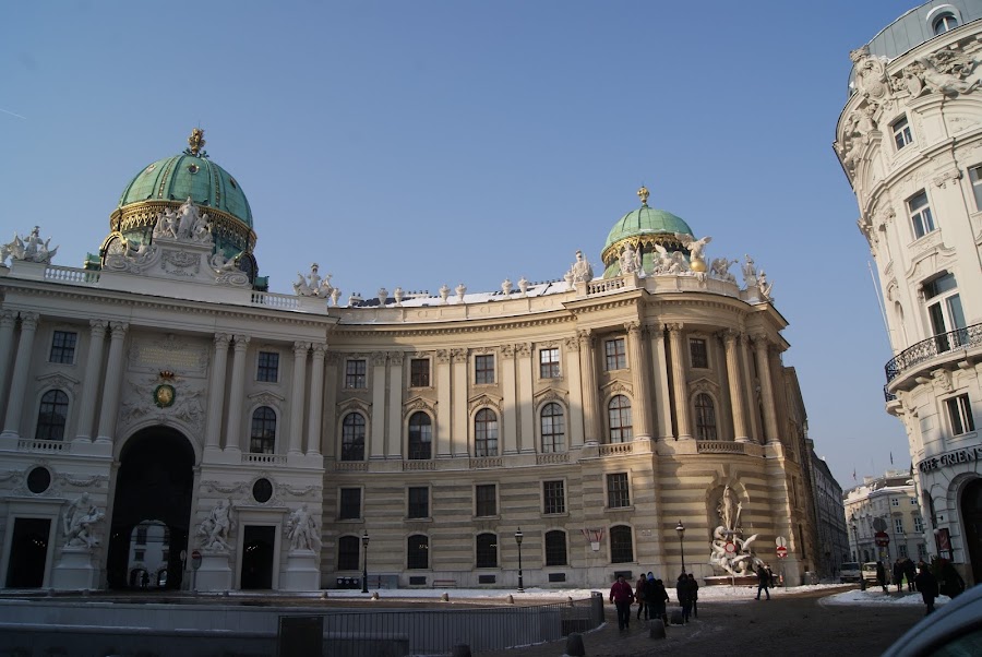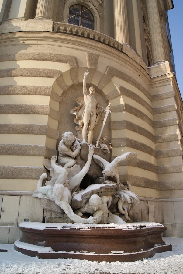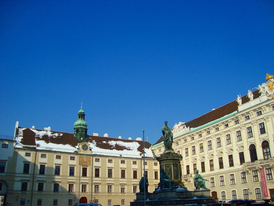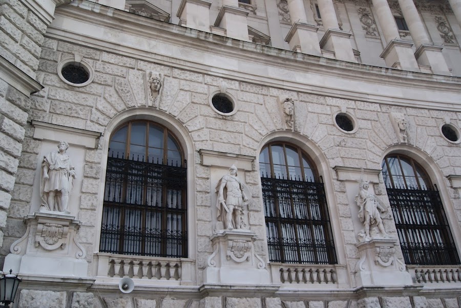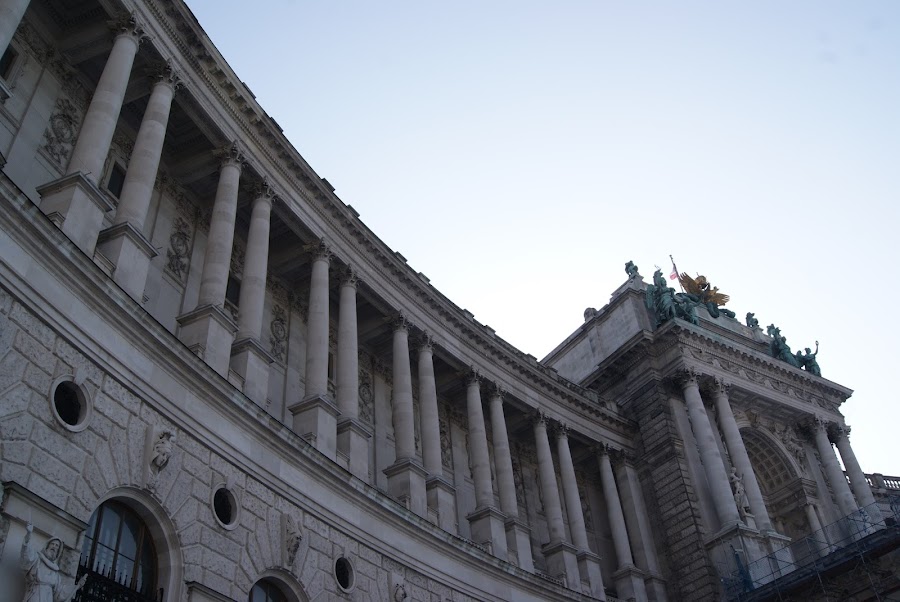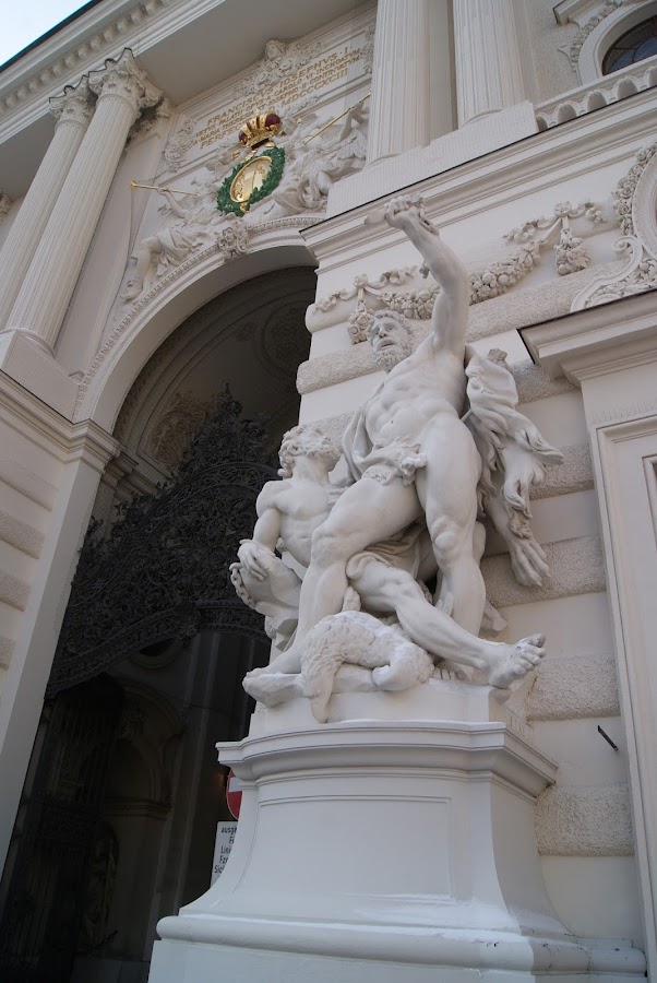 Frente a ella, una de las puertas de entrada al Palacio de Hofburg, con las gigantescas composiciones escultóricas a sus dos lados, con la figura de Hércules como eje central.