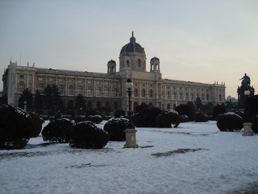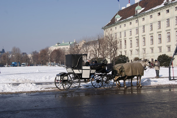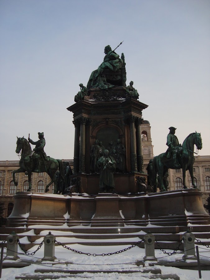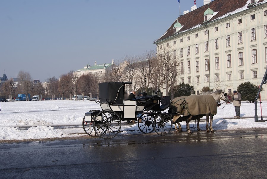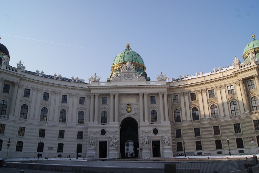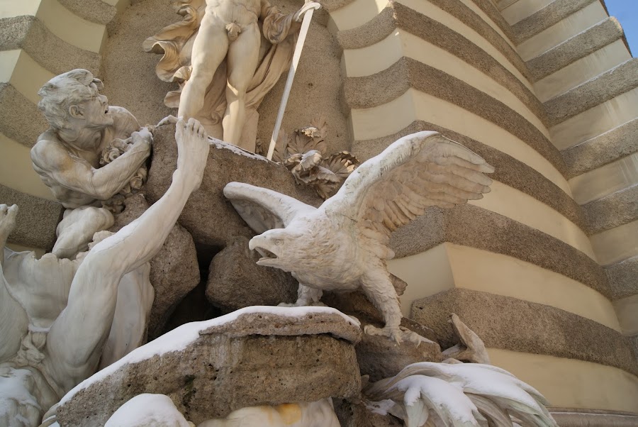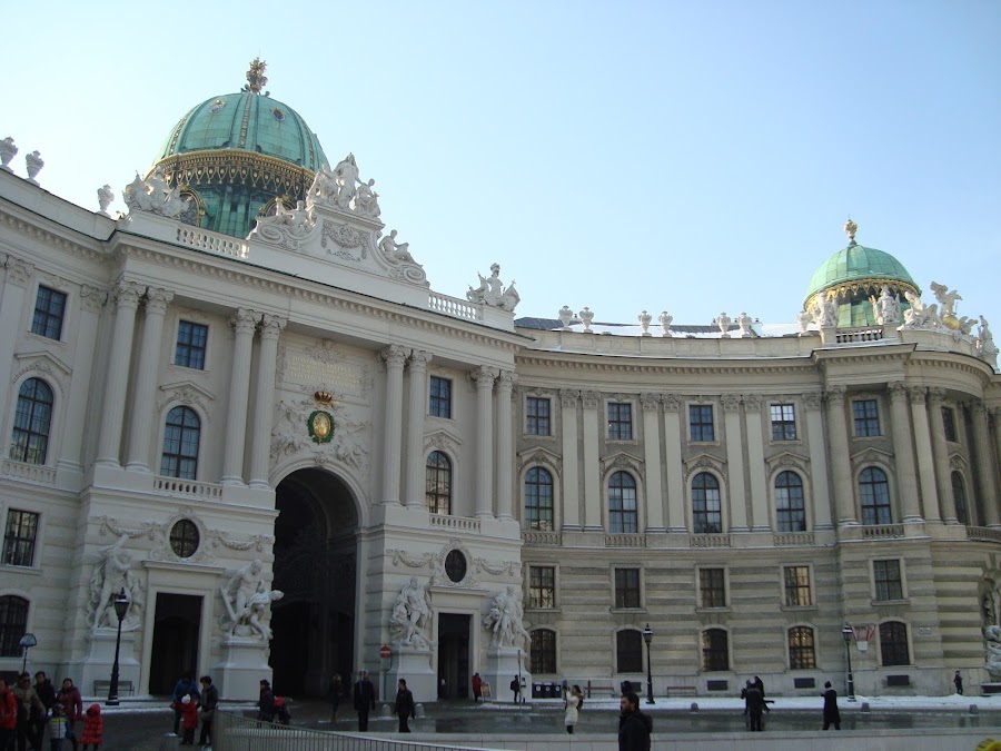 Frente a ella, una de las puertas de entrada al Palacio de Hofburg, con las gigantescas composiciones escultóricas a sus dos lados, con la figura de Hércules como eje central.