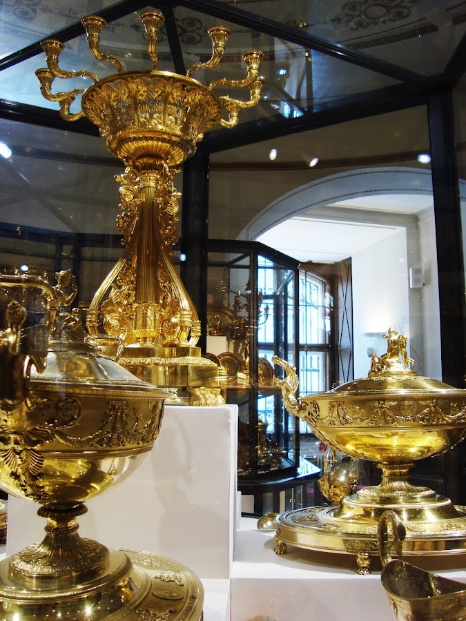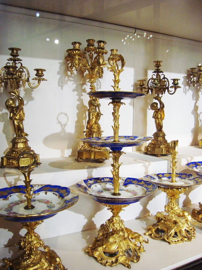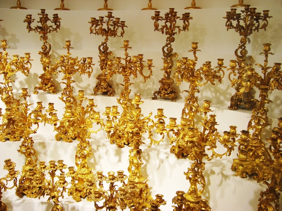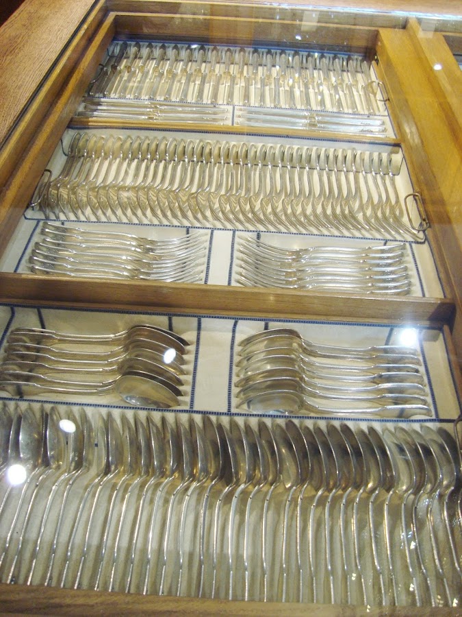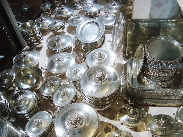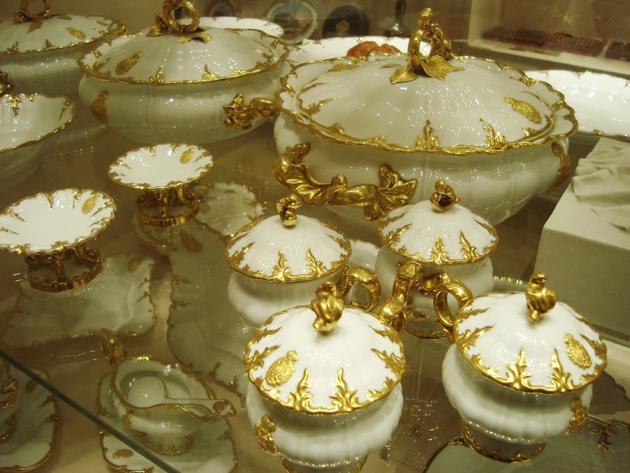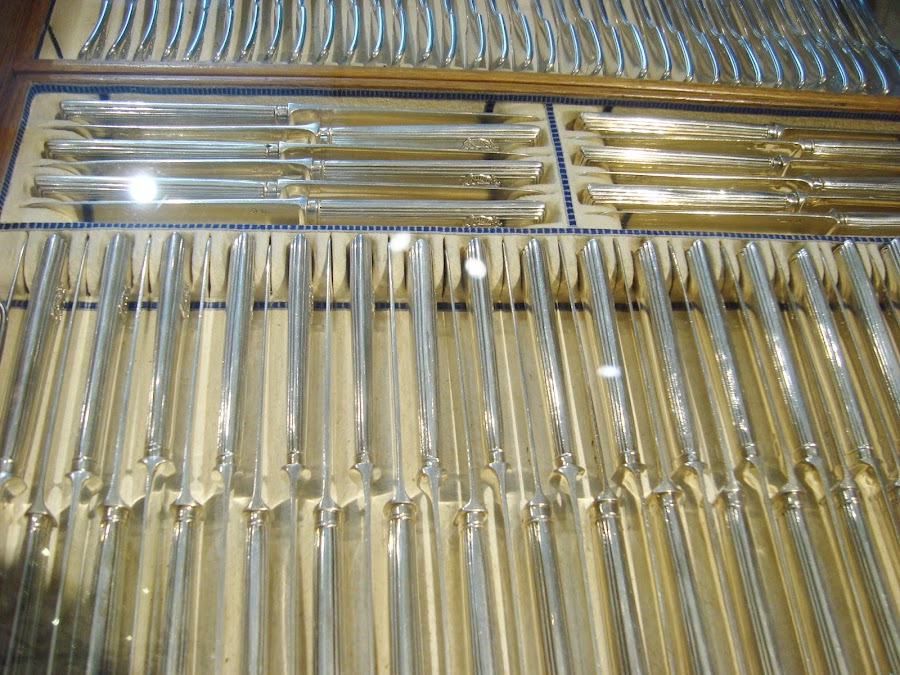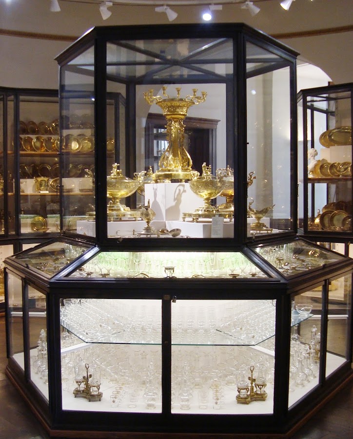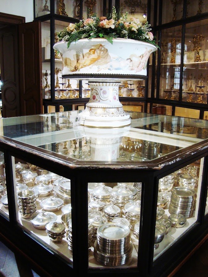 Las colecciones empiezan mostrándose en forma de cuberterías de plata y oro, vajillas de la más fina porcelana oriental y europea, centros de mesa y candelabros de oro macizo, delicadas fuentes que parecen romperse con sólo mirarlas, conjuntos de viaje desmontables para un día de campo o una travesía por mar y las más delicadas servilletas y manteles sobre los que poner las finas copas del mejor cristal veneciano.