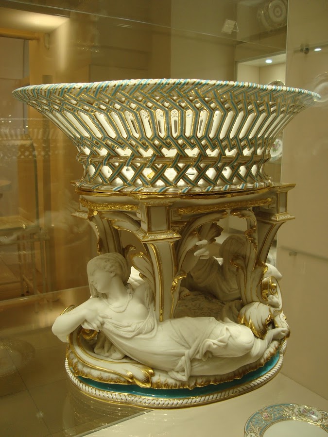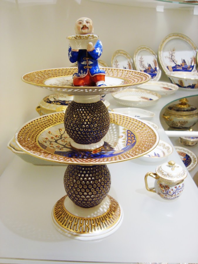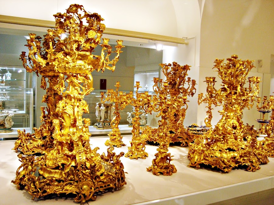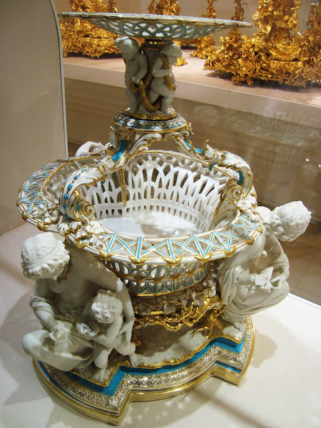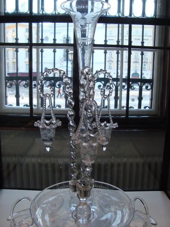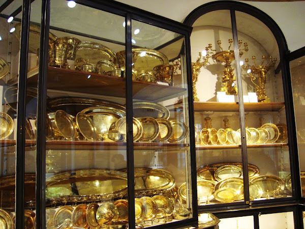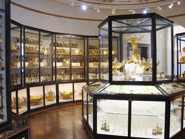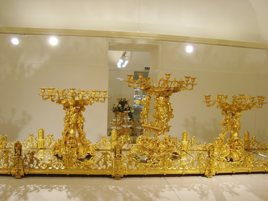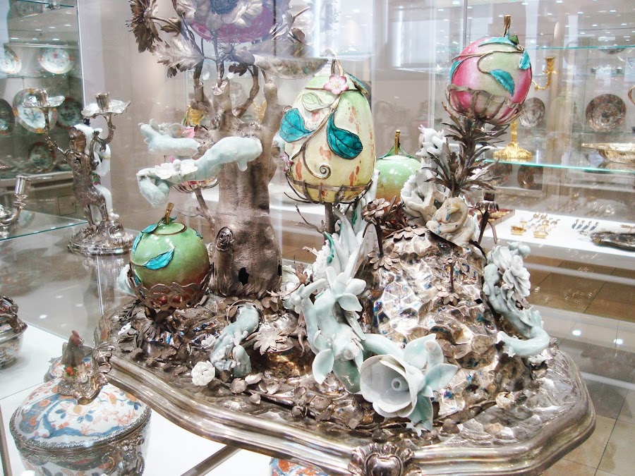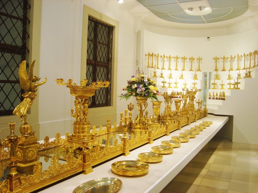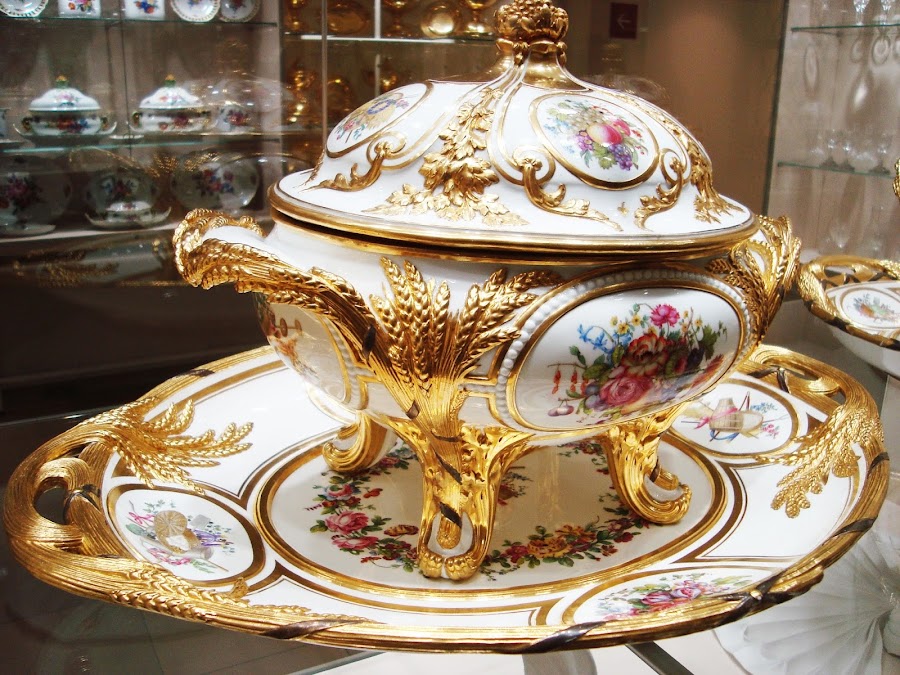 Las colecciones empiezan mostrándose en forma de cuberterías de plata y oro, vajillas de la más fina porcelana oriental y europea, centros de mesa y candelabros de oro macizo, delicadas fuentes que parecen romperse con sólo mirarlas, conjuntos de viaje desmontables para un día de campo o una travesía por mar y las más delicadas servilletas y manteles sobre los que poner las finas copas del mejor cristal veneciano.