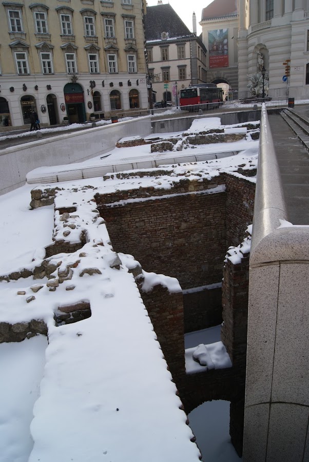 Para entenderlo miremos primero al suelo. Los restos de una casa romana y algunos fragmentos del primigenio Burgteather, nos contemplan desde abajo, aislados y bien conservados, justo en el medio de la plaza.