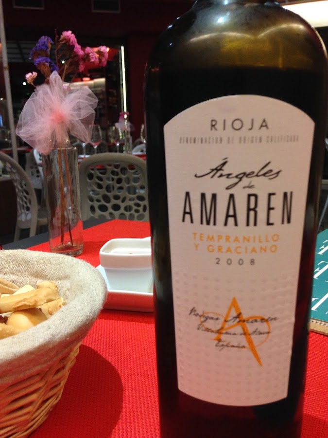 Volviendo a la cena, el vino que nos recomendó Edu fue Ángeles de Amaren 2008, un rioja de tempranillo (85%) y graciano (15%), envejecido 16 meses en barricas de roble francés y americano y con el sello de Juan Luis Cañas. Pues tengo que deciros que este vino ha pasado a ser de mis favoritos, al menos de entre los últimos que he probado. Fue un acierto total. Después de la sorpresa empecé a investigar, y vi que tenía 93 puntos en la Guía Peñín y que estaba considerado un tinto de alta gama. ¡Nivelazo! Lo podéis conseguir por unos 15-16 ??? en tienda.