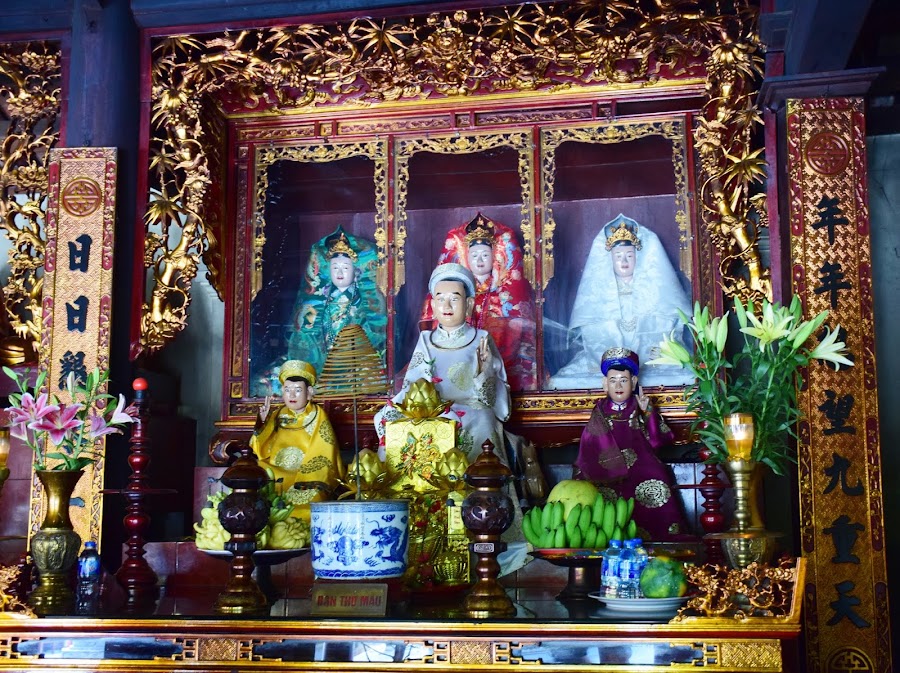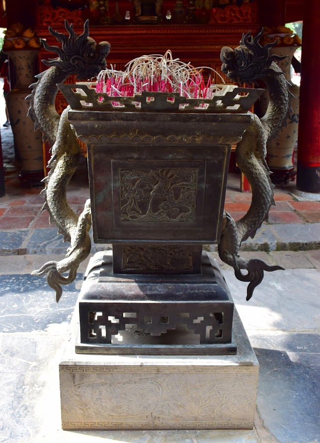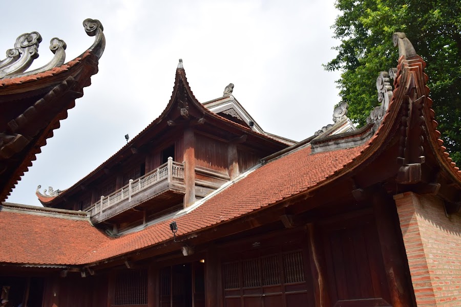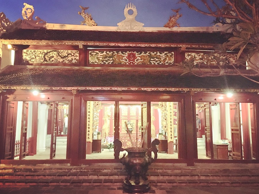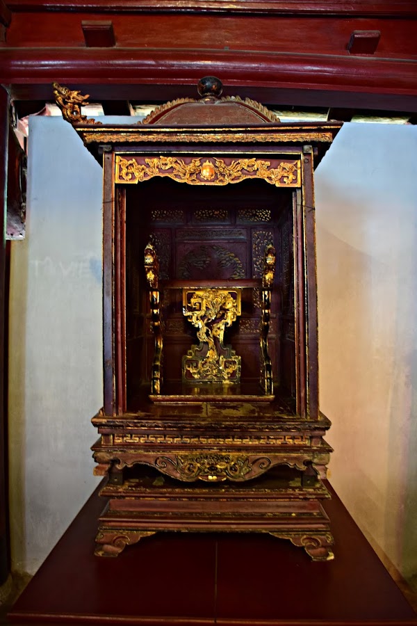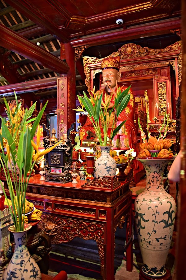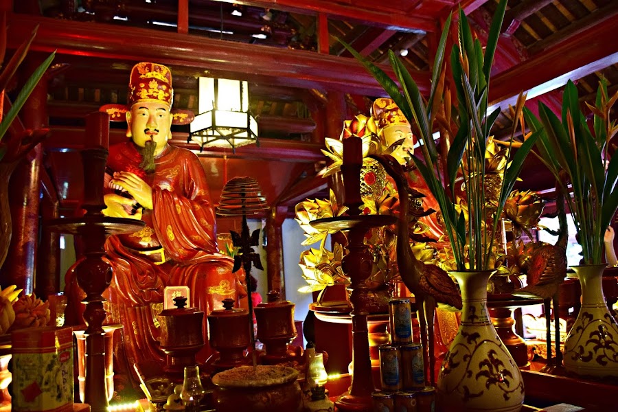 Rodeado de una vegetación frondosa que parece querer hundirse en el agua, el templo está dedicado al erudito Van Xuong, al general vencedor de los mongoles Tran Hung y a La To, patrón de los médicos.