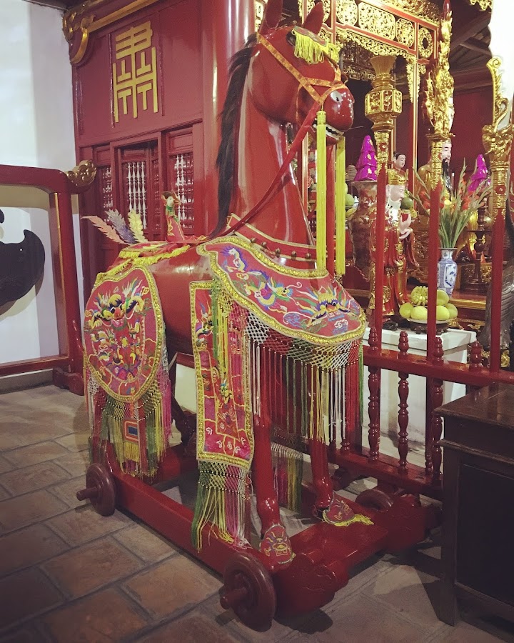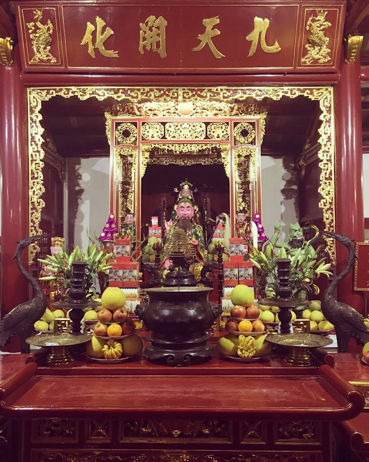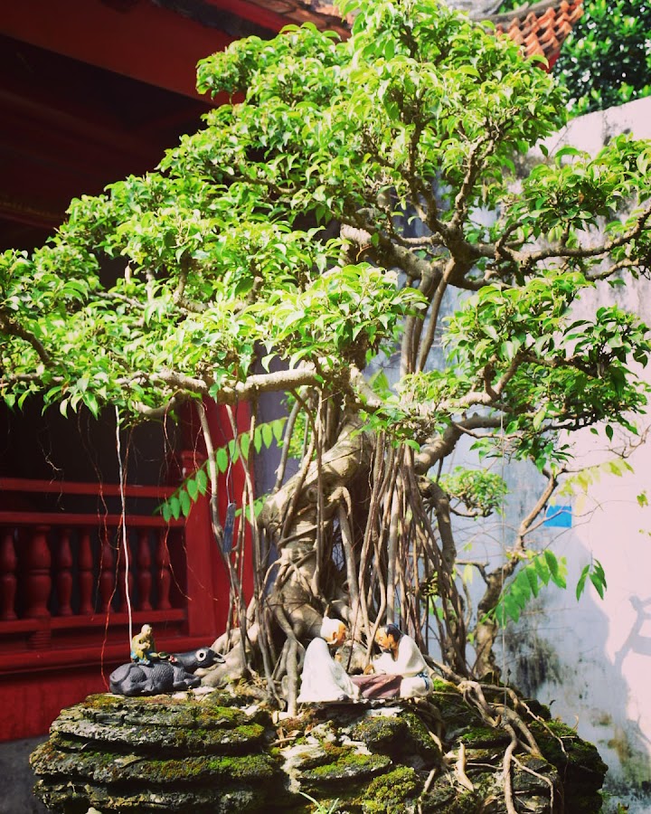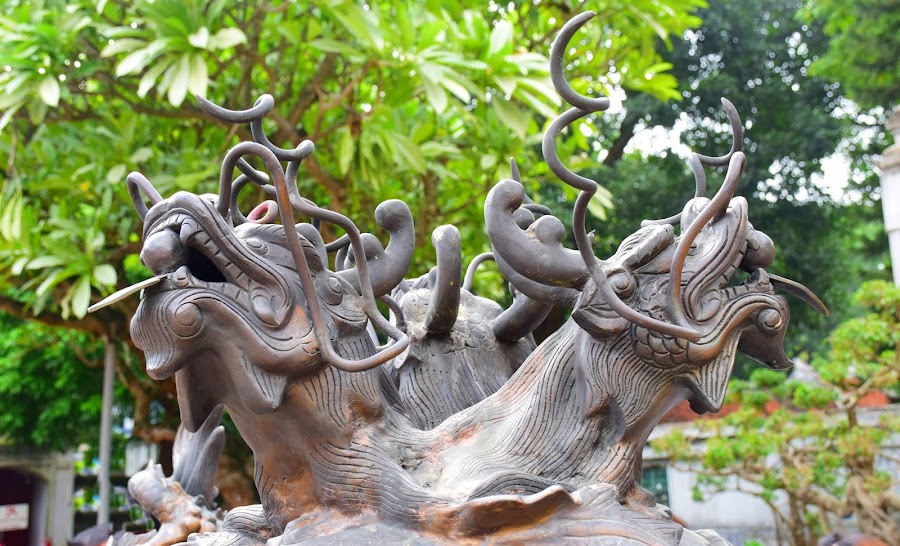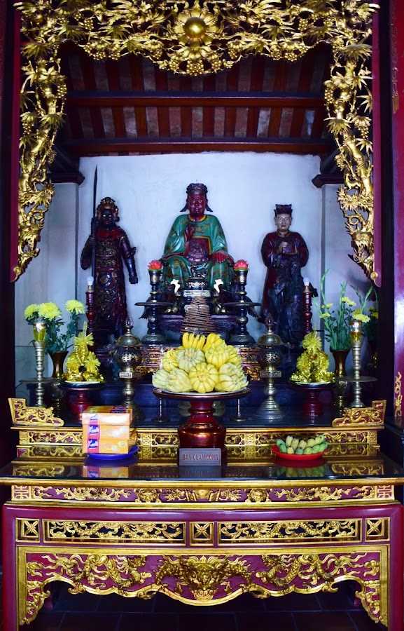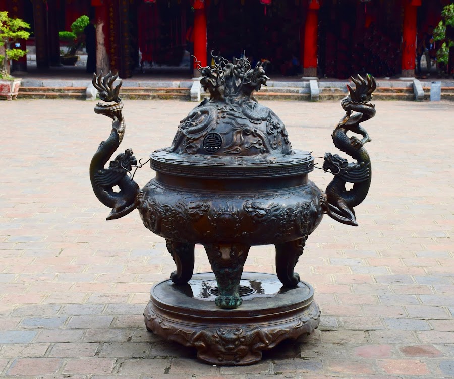 Rodeado de una vegetación frondosa que parece querer hundirse en el agua, el templo está dedicado al erudito Van Xuong, al general vencedor de los mongoles Tran Hung y a La To, patrón de los médicos.