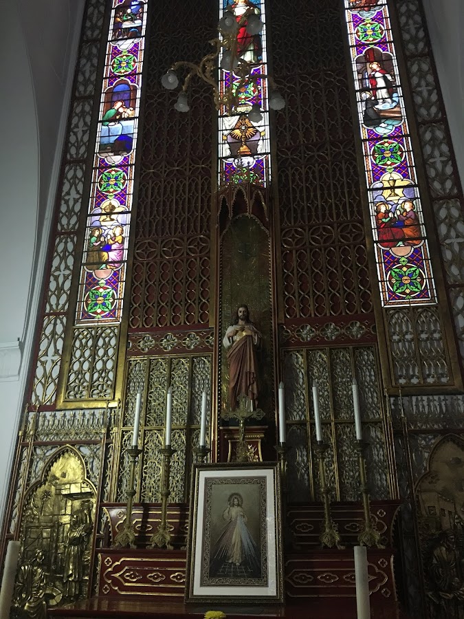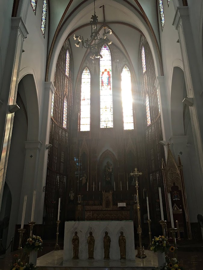 Ya en su interior, lo que más sorprende son sus magníficas vidrieras, hechas en Francia y transportadas hasta Vietnam.