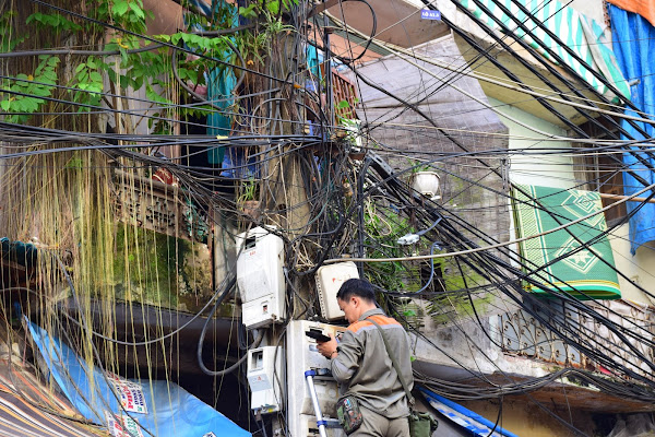 Como sorprendente es ver a este señor trepado en una escalera intentando leer o reparar un contador de luz, en una ciudad en la que los "enganches" ilegales forman parte de los adornos de la ciudad.